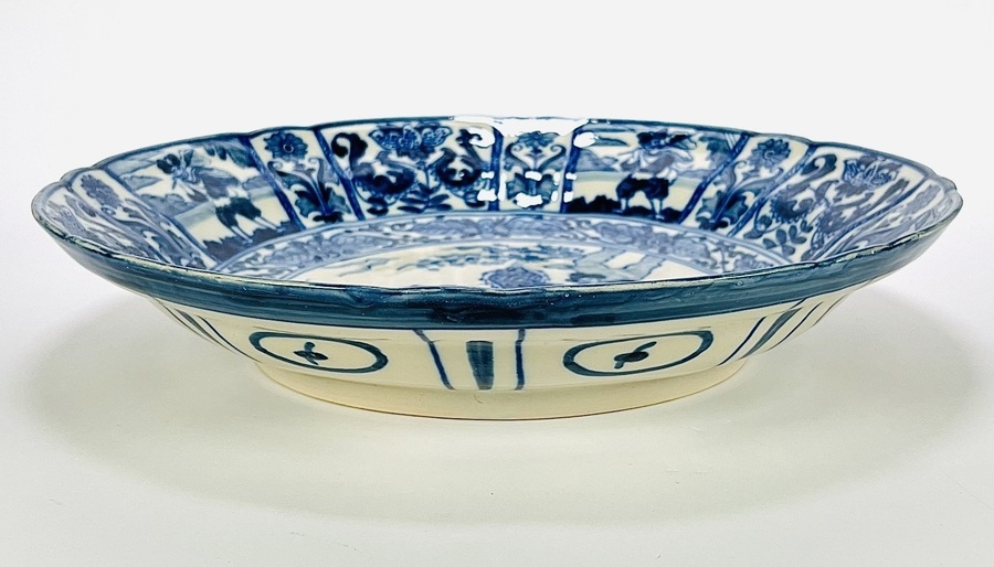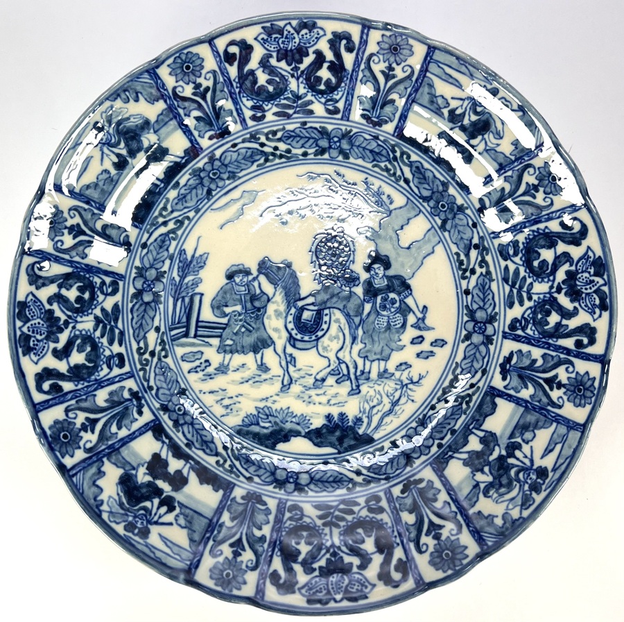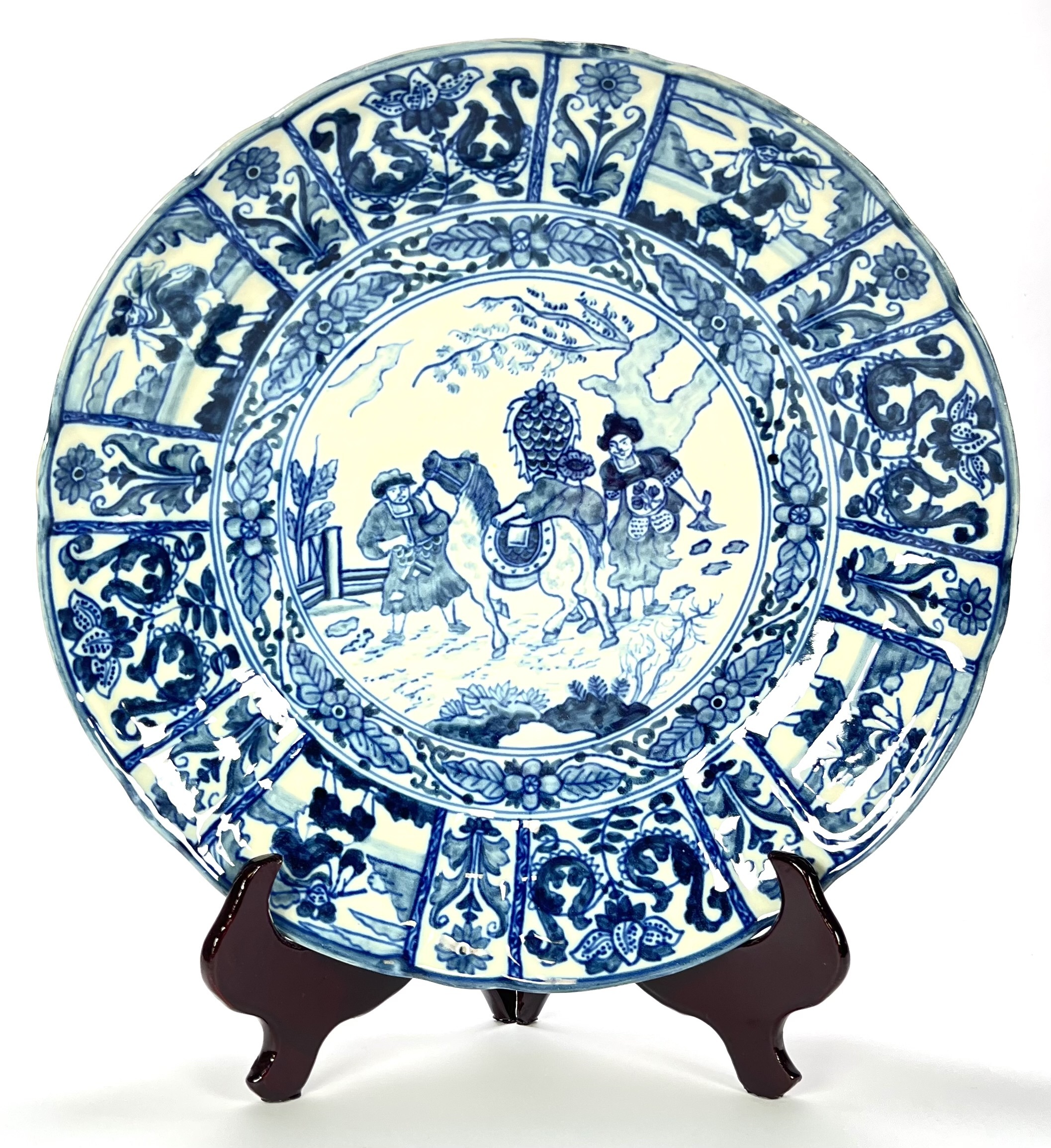 Wandbord van tinglazuur aardewerk, handbeschilderd in kobaltblauw door Koninklijke Tichelaar Makkum, Nederland. Het wandbord is gemerkt met modelnummer '464 Holland' en dateert uit het midden 20e eeuw, circa 1940–1960. Het decor is een historiserende imitatie van de Chinese Chine de Commande stijl met twee figuren en een beladen paard in het centrum. Klaar om te bieden? Registreer je nu en doe mee aan de veiling! |