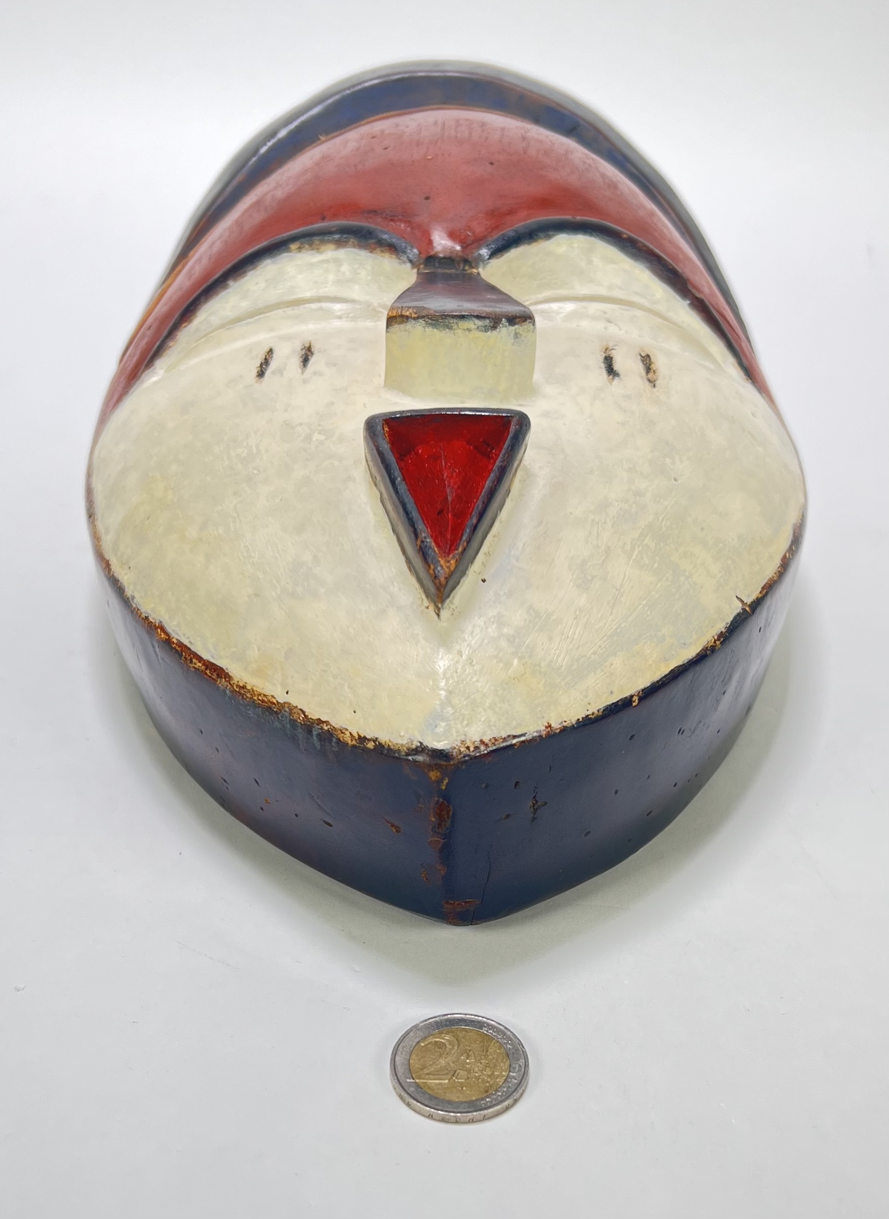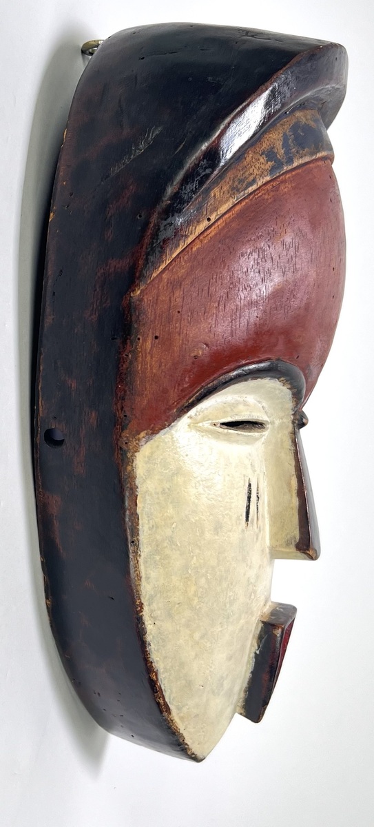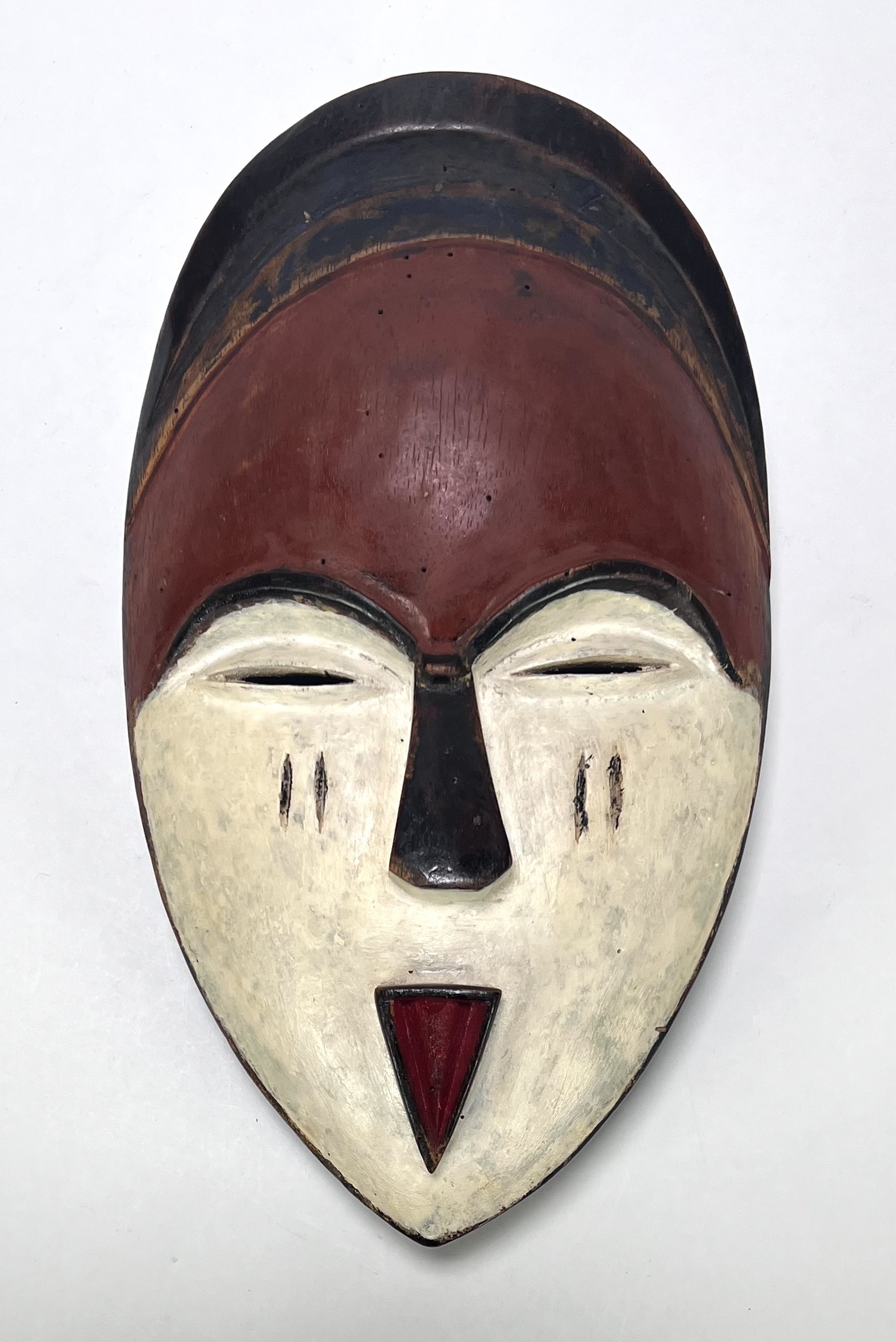 Houten Fang Ngil wandmasker uit Gabon, midden 20e eeuw, uitgevoerd in houtsnijwerk met polychrome afwerking in wit pigment, rood en zwart. Het hartvormige gelaat toont smalle ogen, littekenversieringen op de wangen en een rode driehoekige mond. Dit type masker werd traditioneel gebruikt binnen de Fang-cultuur bij initiaties en rechtspraak. Jouw kans op dit wandmasker begint met registreren – bied live of online mee! |