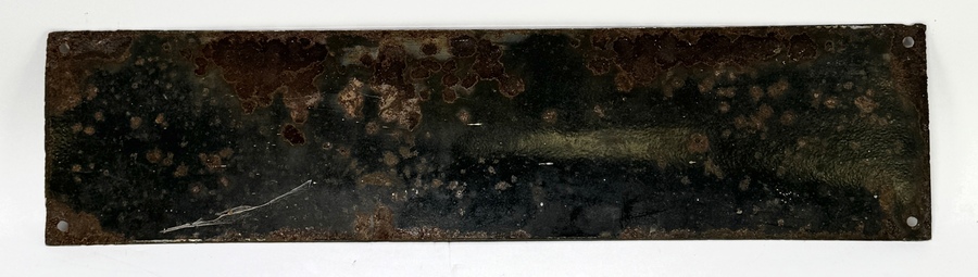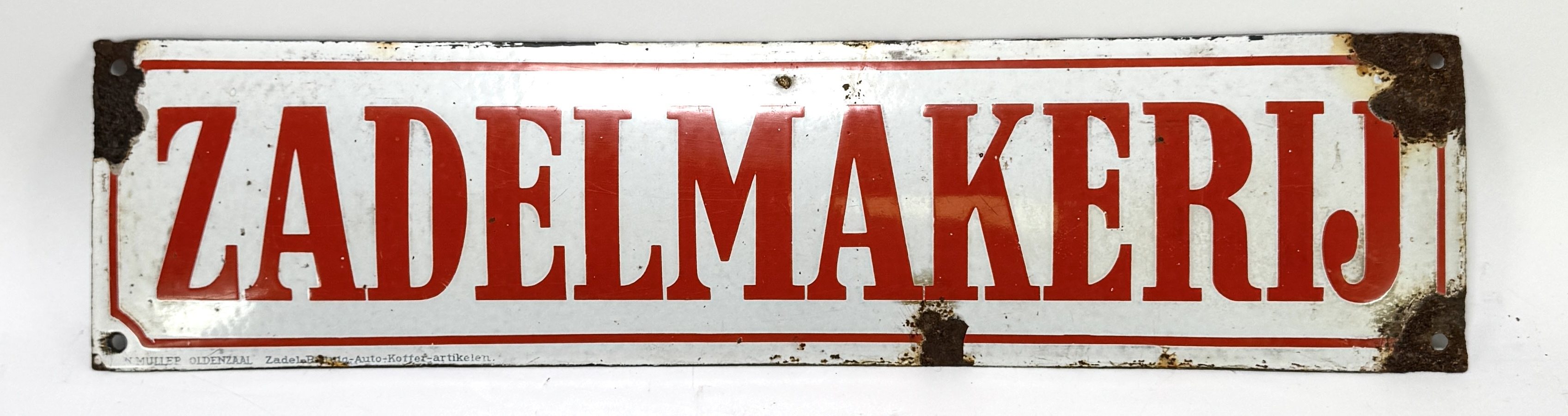 Geëmailleerd metalen bord “Zadelmakerij”, N. Muller, Oldenzaal, Nederland, eerste helft 20e eeuw. Het rechthoekige bord toont rode kapitalen op witte achtergrond met rode bies, voorzien van montagegaten en onderaan de aanduiding van leveringen voor rijtuig-, auto- en kofferartikelen. Hierbij een lederen mini zadel. Zeker zijn van deelname? Plaats vanaf 21 november een schriftelijk bod online! |