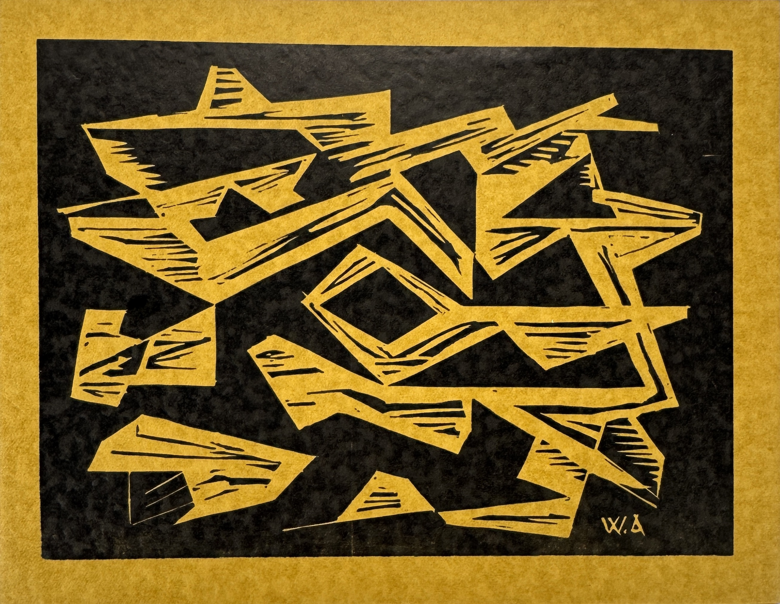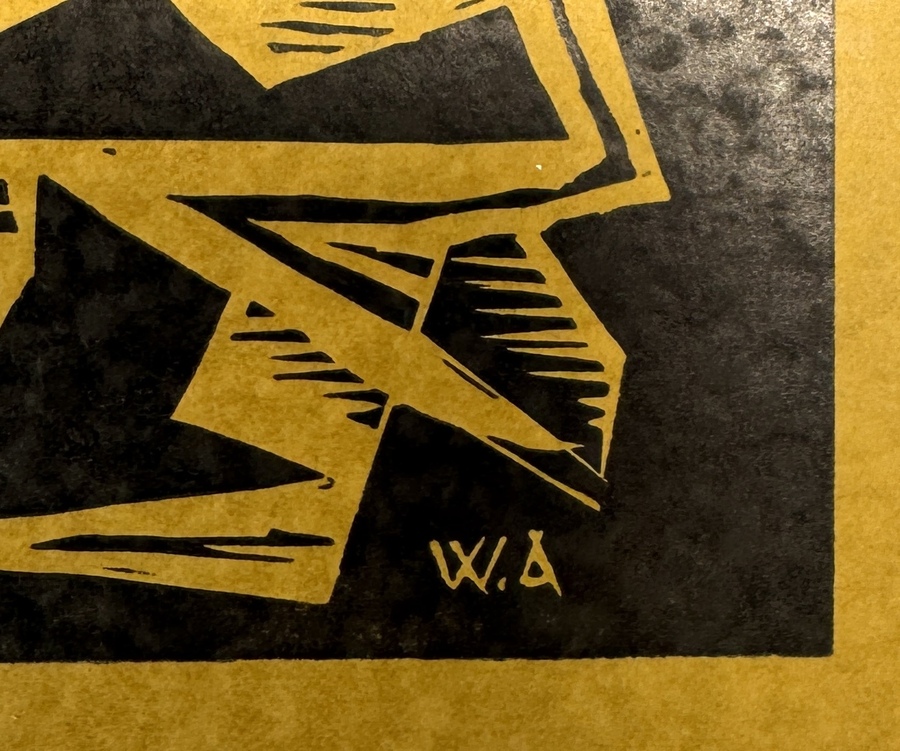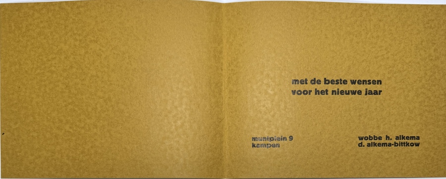 Zeefdruk van Wobbe Alkema (1900–1984), uitgevoerd op papier als een nieuwjaarskaart in geometrisch abstracte stijl. Het werk uit de midden 20e eeuw toont een dynamische compositie van hoekige, okergele en zwarte vlakken. Rechtsonder gemonogrammeerd W.A., de binnenzijde bevat een gedrukte nieuwjaarswens van Wobbe H. Alkema en zijn vrouw, afkomstig uit Kampen. Jouw kans op deze zeefdruk begint met registreren – bied live of online mee! |