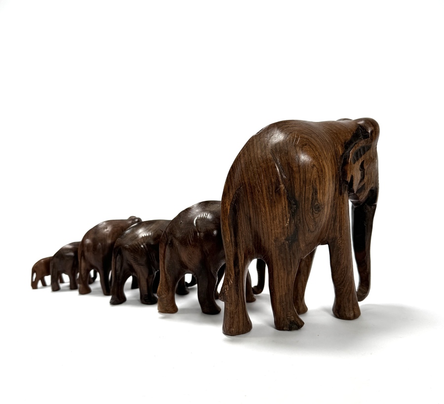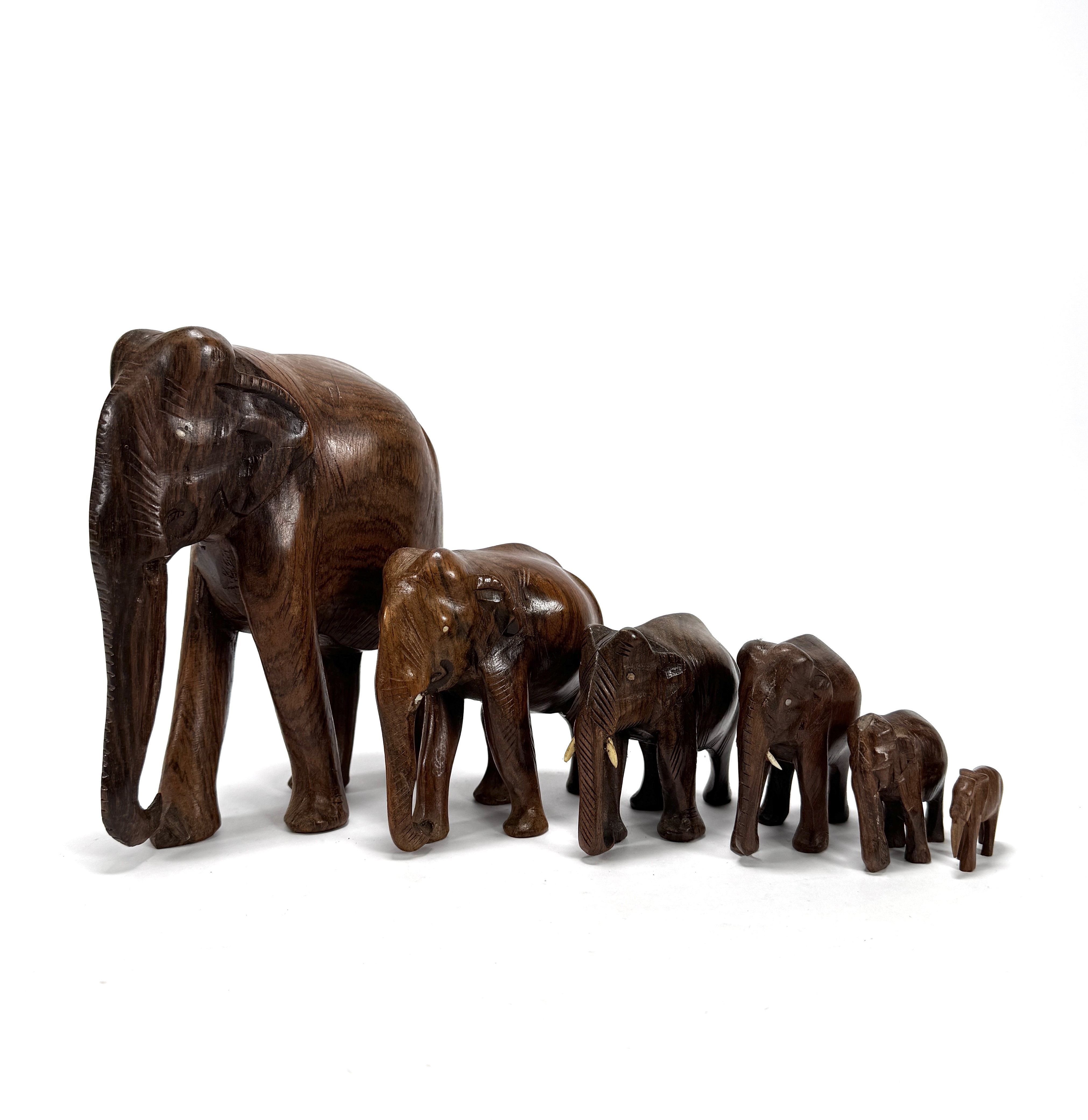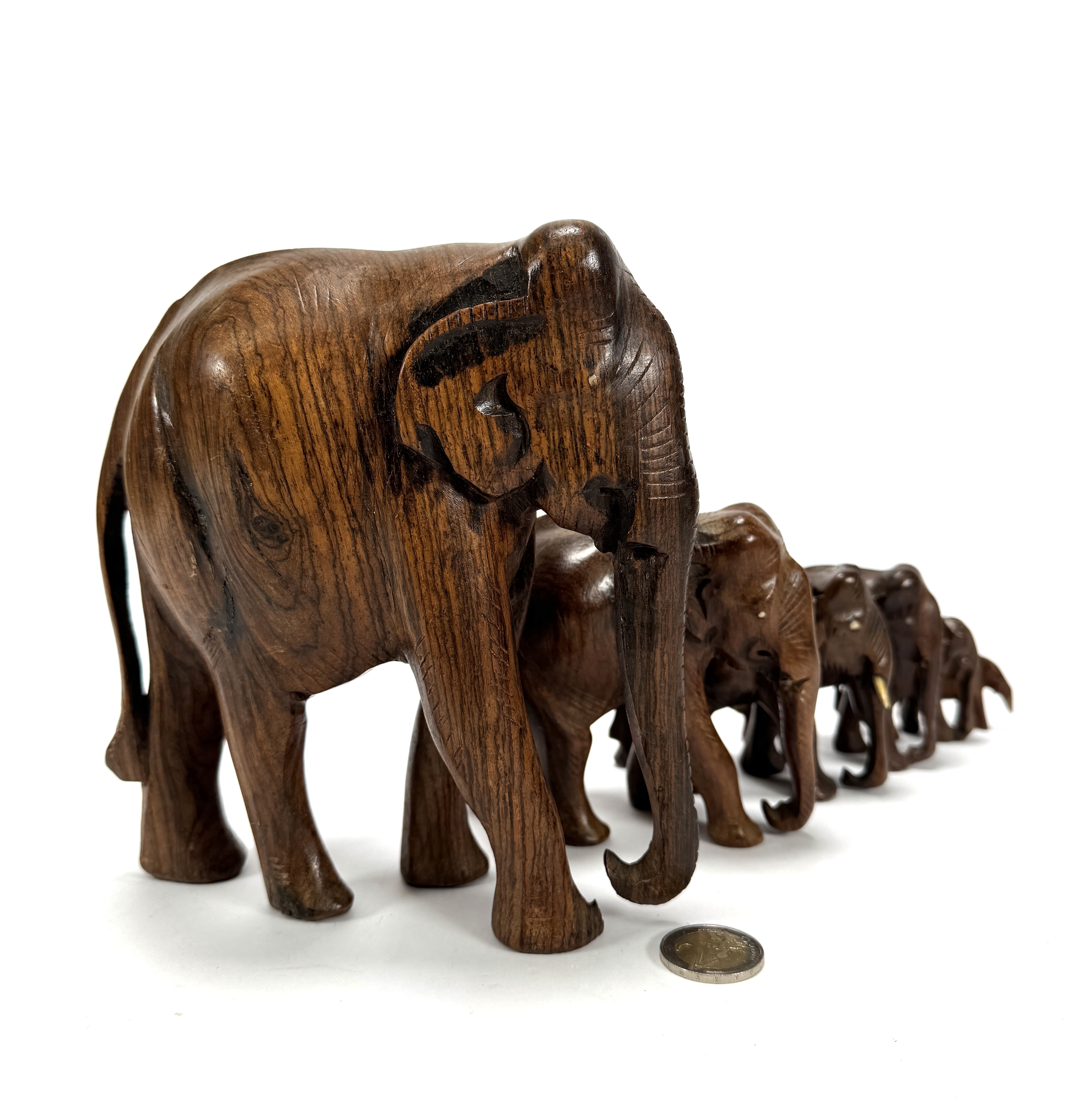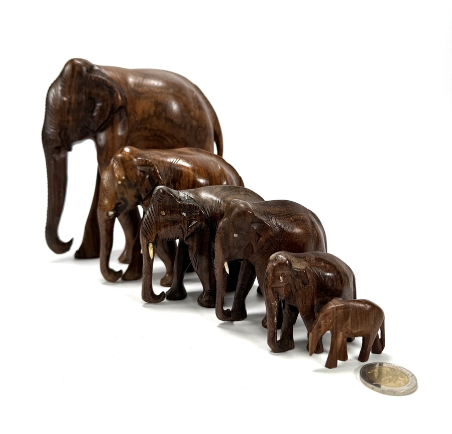Zes houten Afrikaanse olifanten, tweede helft 20e eeuw. De beeldjes variëren in formaat en tonen naturalistisch uitgewerkte details zoals oren, poten en slagtanden, waarvan enkele zijn uitgevoerd in been. Geïnteresseerd? Bezoek onze kijkdagen op 29, 30 of 31 augustus van 11:00 tot 17:00 uur! |