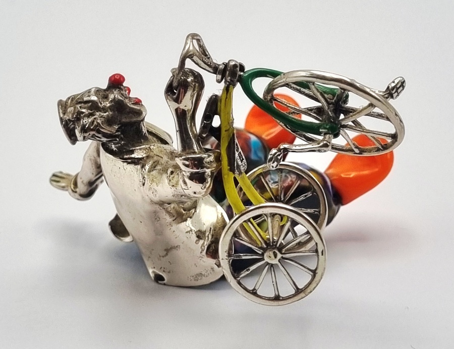Clownsfiguur in figuratieve stijl, ontwerp van Vittorio Ancini, tweede helft 20e eeuw, Italië. Uitgevoerd in 925/1000 zilver met handgevormde meerkleurige Murano-glazen broek en feloranje schoenen. De clown houdt een fiets met groene en gele details omhoog. Gemerkt “925 Italy” en voorzien van originele Murano-sticker onder de voet. Klaar om te bieden? Registreer je nu en doe mee aan de veiling! |