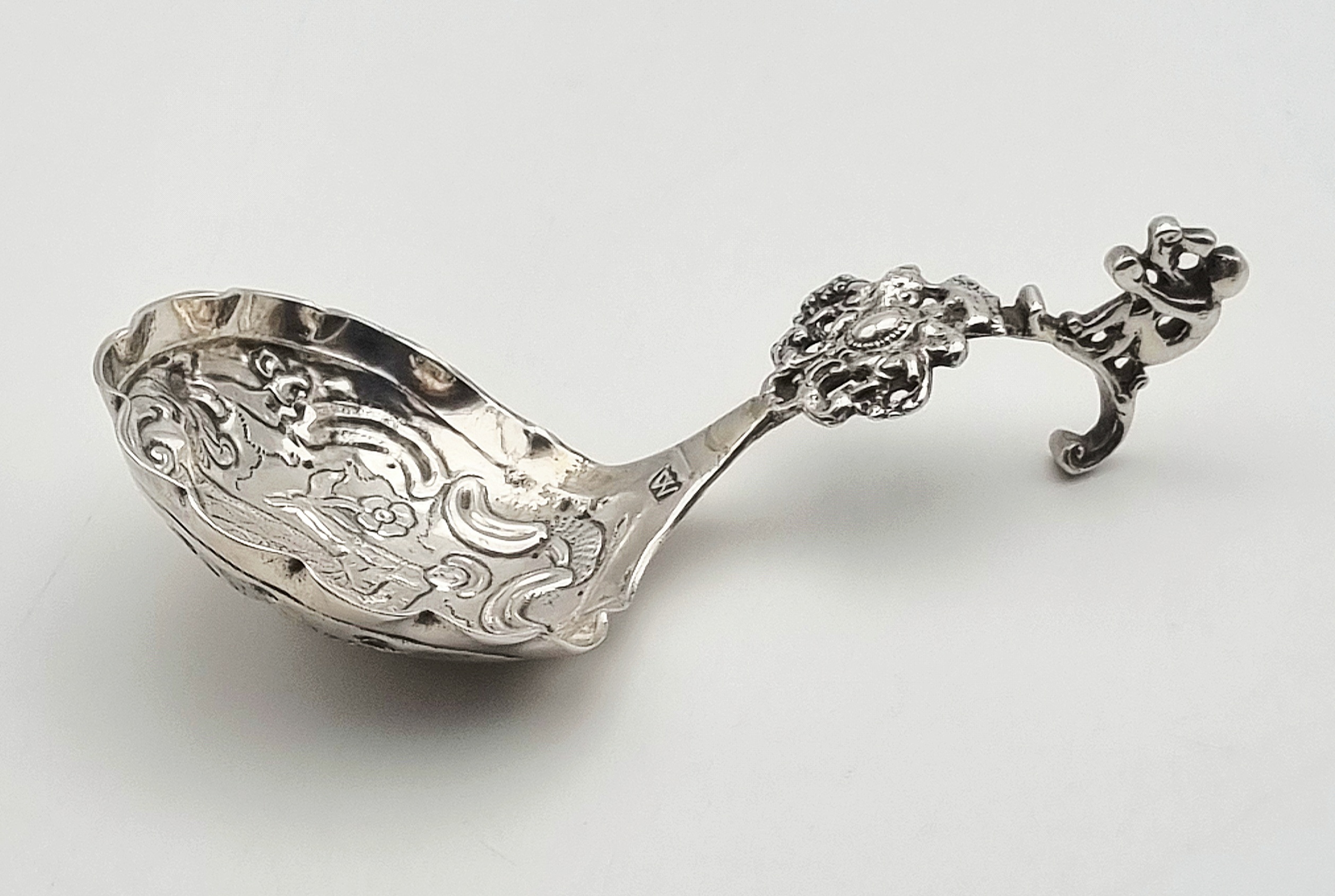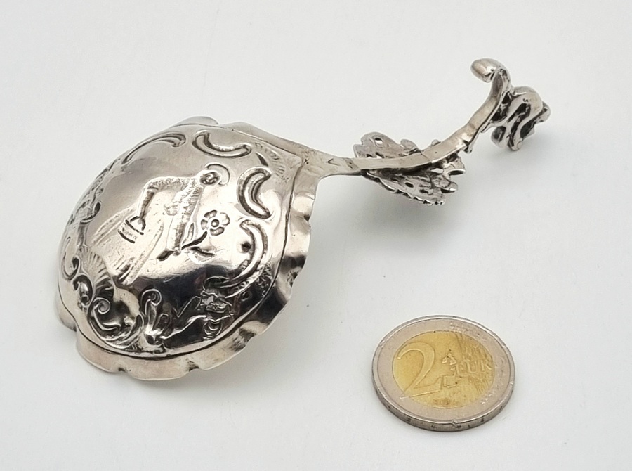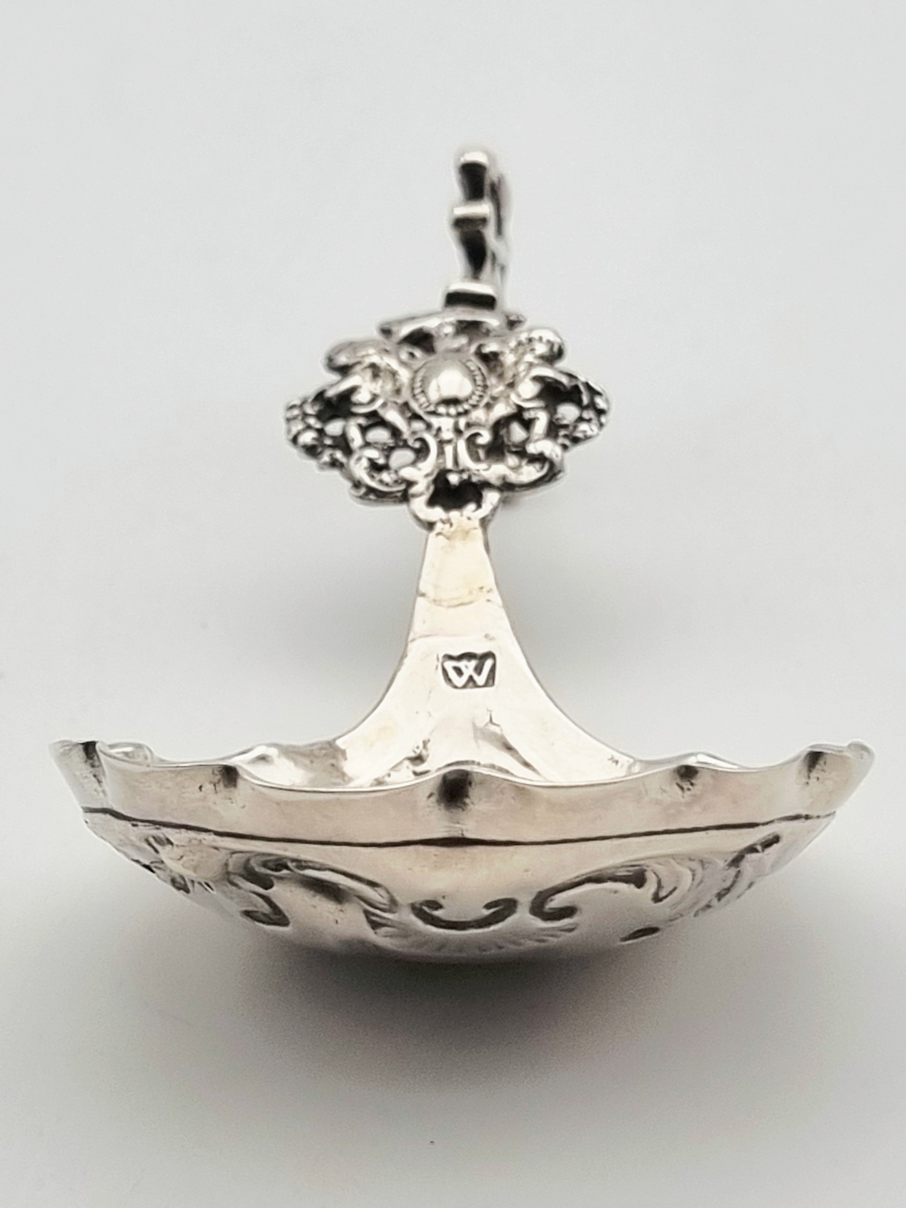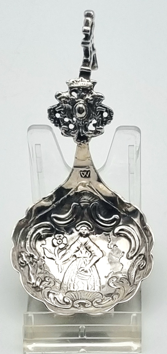 Antieke zilveren roomlepel of zwanenhalslepel, uitgevoerd in de late rococo stijl uit de 18e eeuw. De lepel dateert circa 1790, vervaardigd door de Friese zilversmid Dirk Sakes van der Werf (1744–1824) uit Sneek, gemerkt met meesterteken VdW. De bak is gedreven met een figuratieve pastorale scène van een figuur met een bloem. De gebogen zwanenhals steel is afgewerkt met een gegoten en opengewerkt ornament en zittend figuur. Kom langs tijdens de kijkdagen (28 t/m 30 november) en ontdek deze roomlepel zelf! |