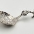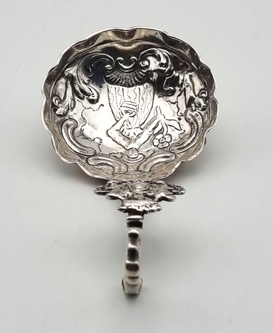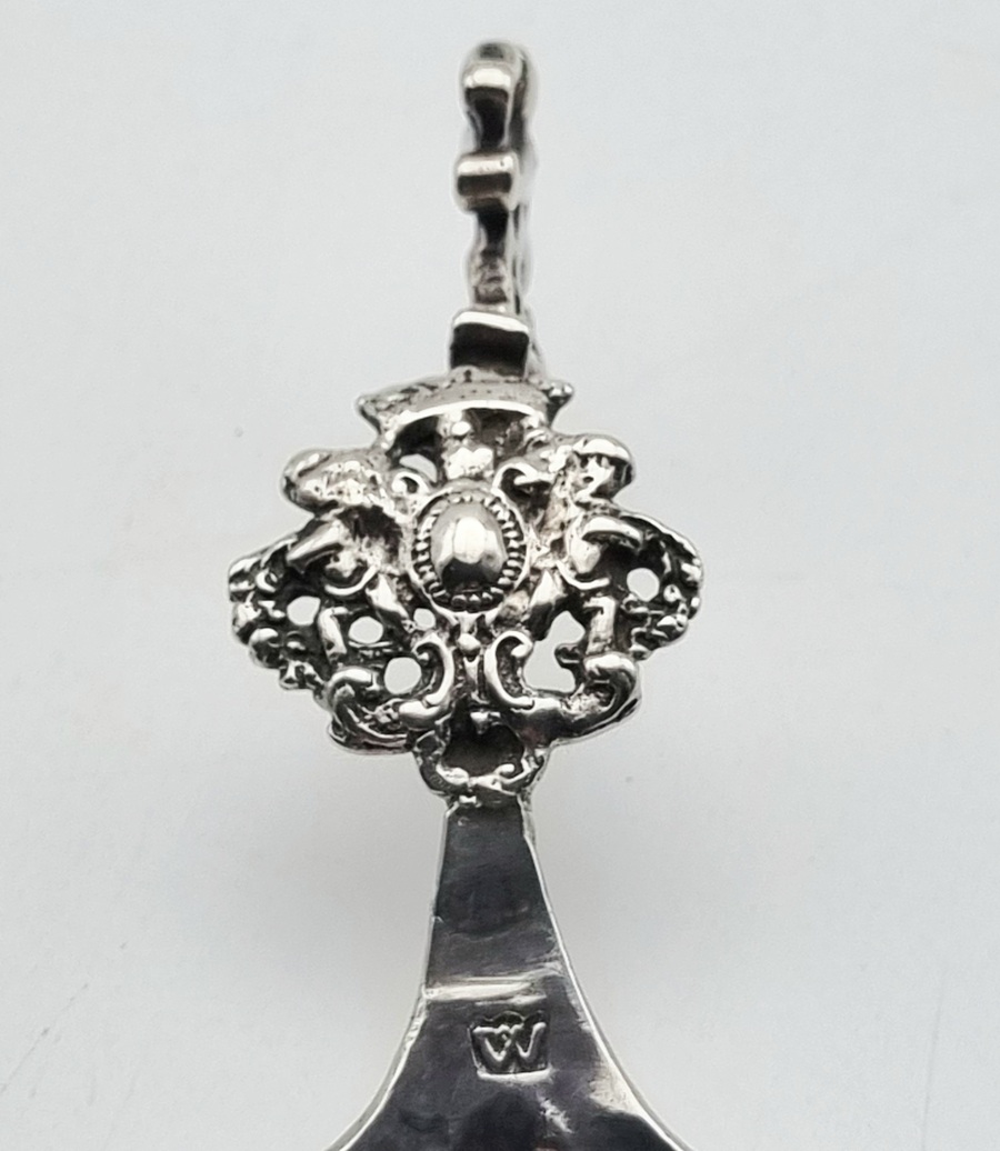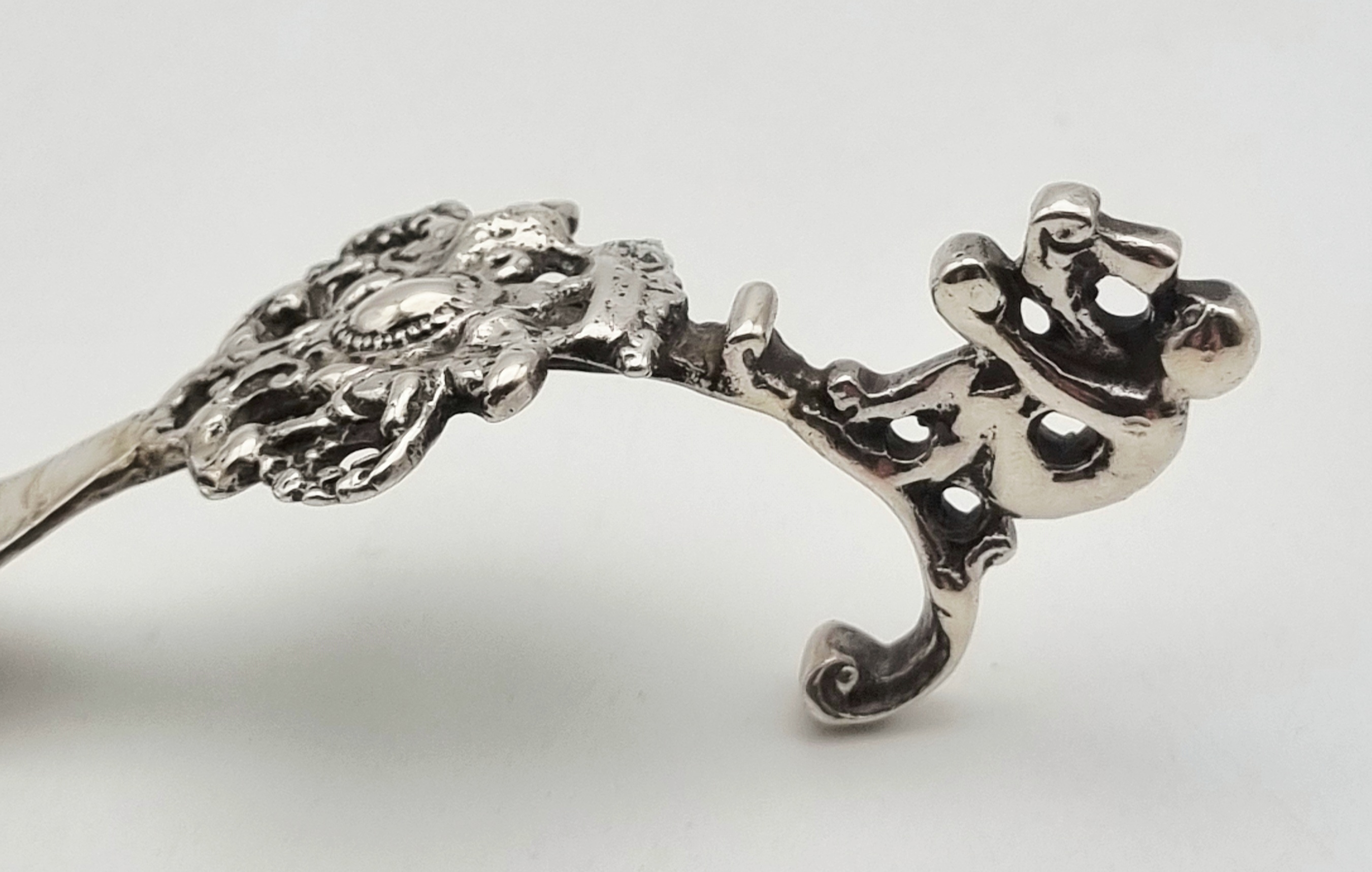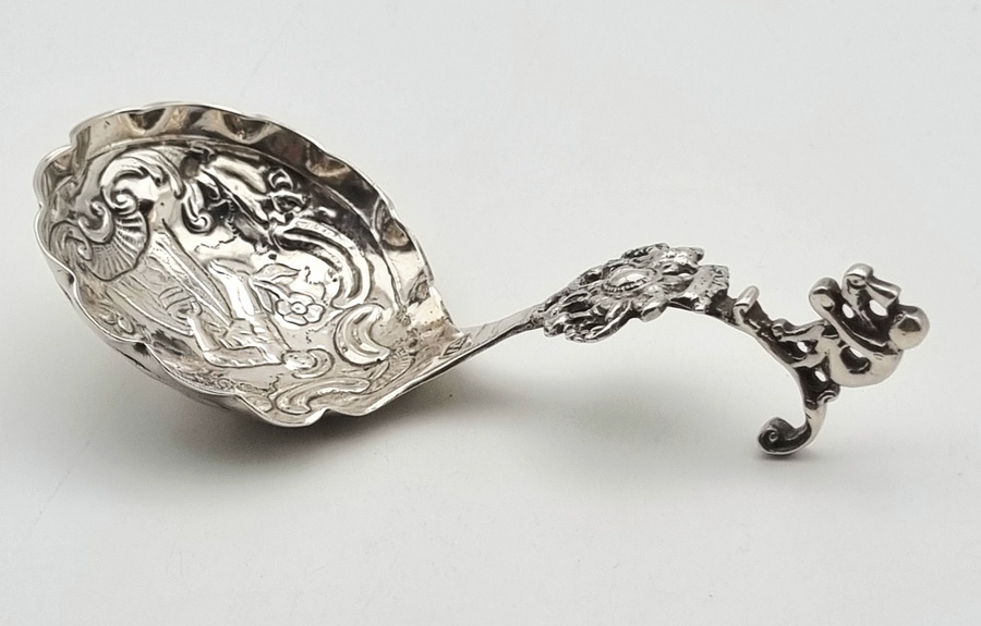 Antieke zilveren roomlepel of zwanenhalslepel, uitgevoerd in de late rococo stijl uit de 18e eeuw. De lepel dateert circa 1790, vervaardigd door de Friese zilversmid Dirk Sakes van der Werf (1744–1824) uit Sneek, gemerkt met meesterteken VdW. De bak is gedreven met een figuratieve pastorale scène van een figuur met een bloem. De gebogen zwanenhals steel is afgewerkt met een gegoten en opengewerkt ornament en zittend figuur. Kom langs tijdens de kijkdagen (28 t/m 30 november) en ontdek deze roomlepel zelf! |