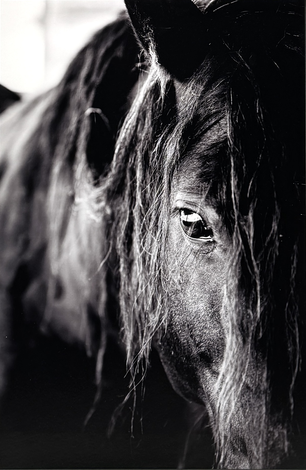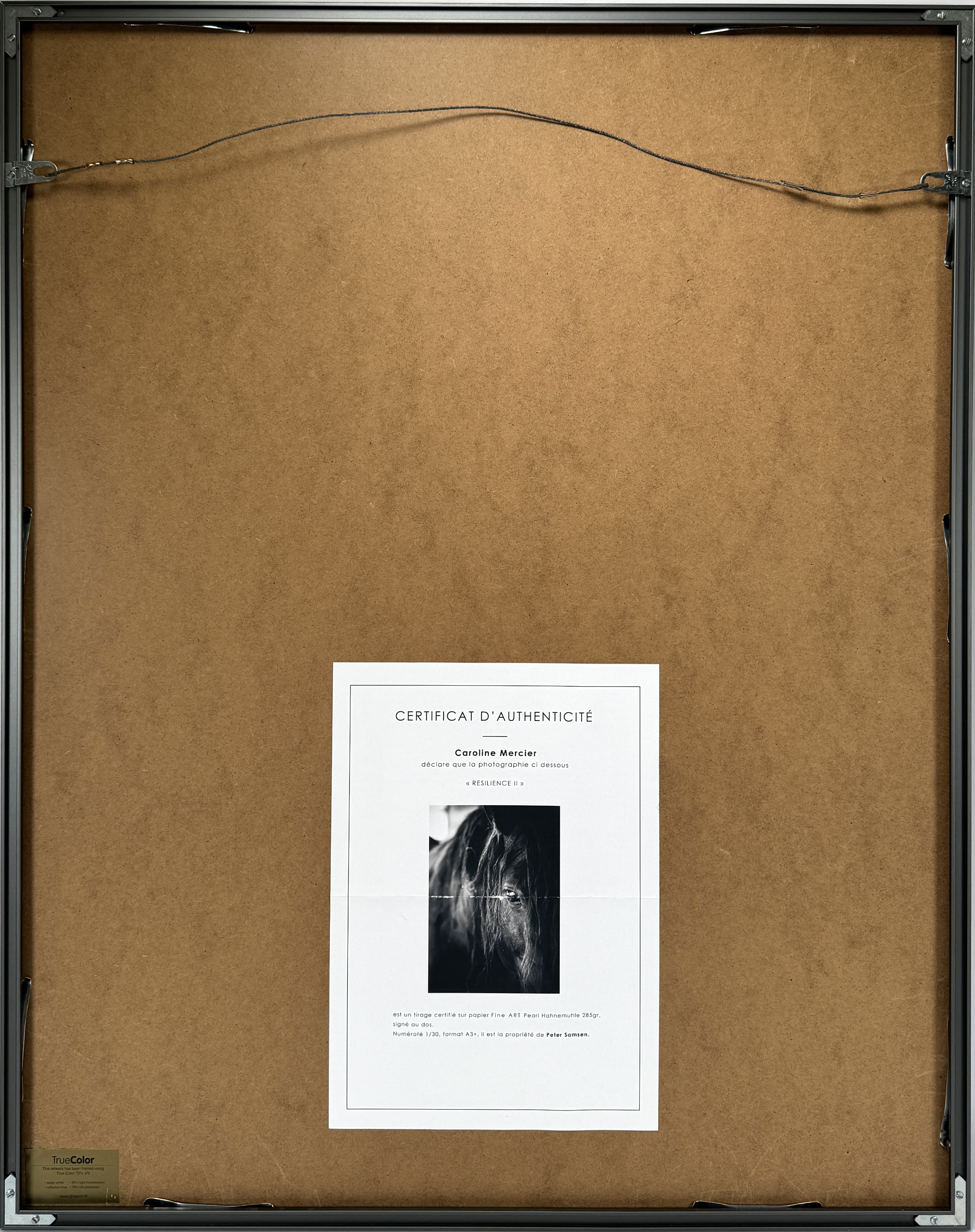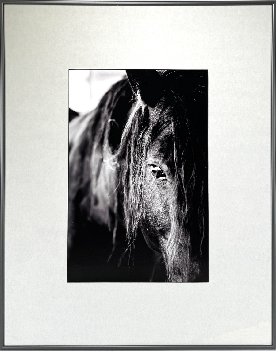 Fotoprint op papier van Caroline Mercier (1981), getiteld “Resilience II”, een zwart-wit paardenportret in A3+-formaat, oplagenummer 1/30. Uitgevoerd als fine art print op Hahnemühle-papier, 21e eeuw Frankrijk. Het werk toont een intens close-up beeld van een paard met sterke licht-schaduwcontrasten en realistische stijlkenmerken. Eerst de foto zien voordat je biedt? Bezoek onze kijkdagen op 28, 29 en 30 november van 11:00 tot 17:00 uur! |