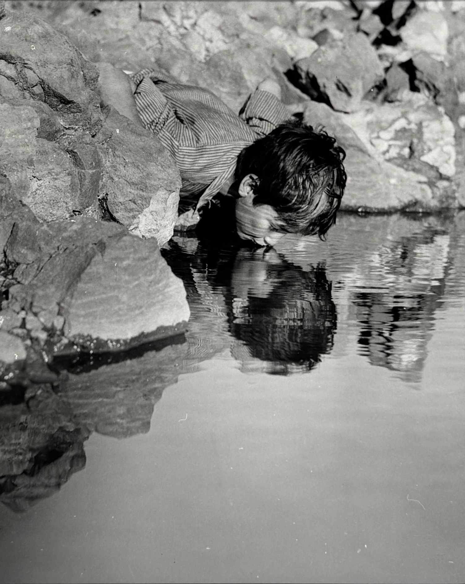 Zwart-witfoto, Dominique Darbois – jongen drinkt water, ca. 1960