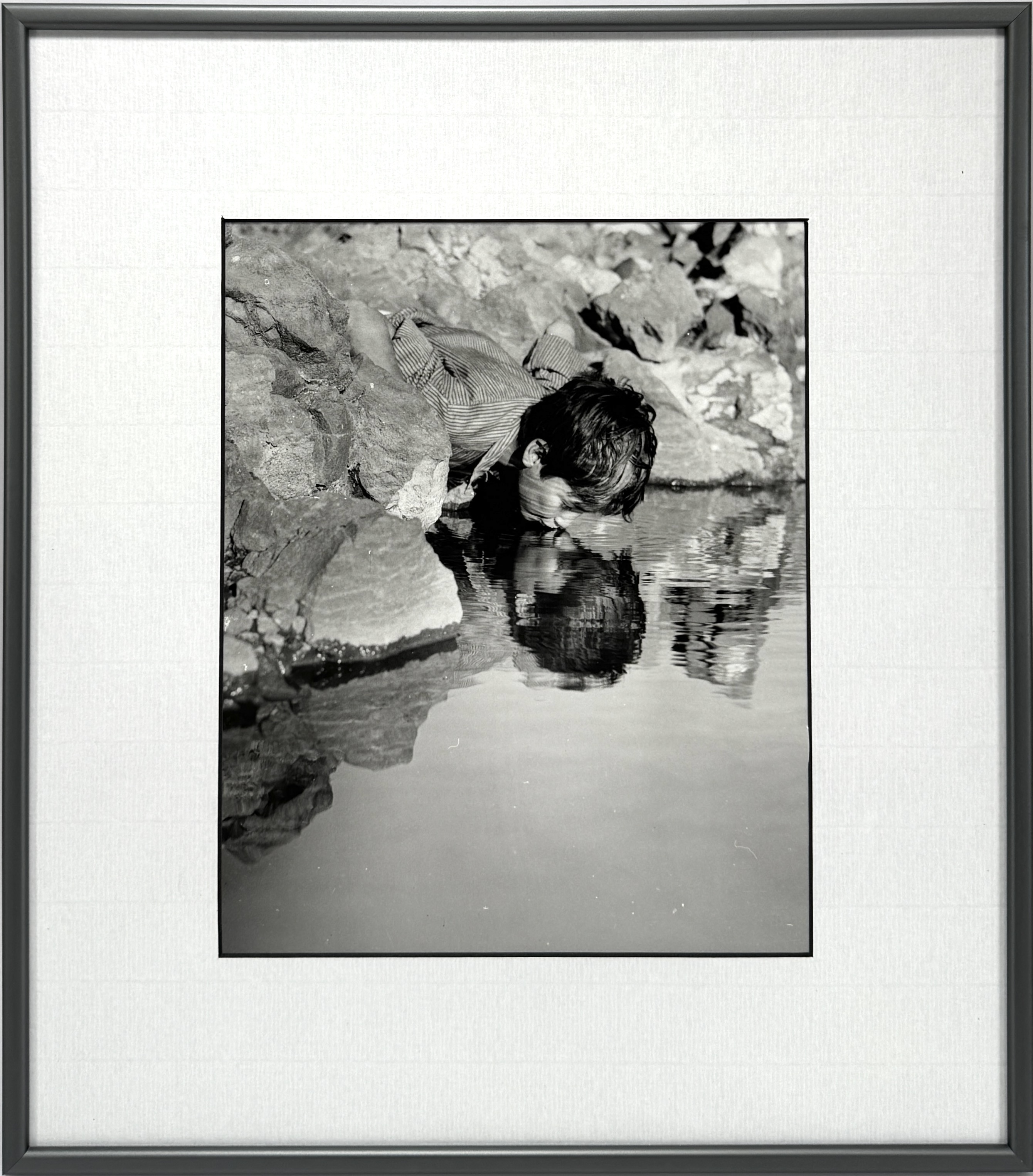 Zwart-witfoto op fotopapier van Dominique Darbois (1925–2014), ca. 1955–1965. De humanistisch-documentaire opname toont een jongen die drinkt uit een rotsig waterbekken, met zachte lichtval en spiegeling in het water. Originele zilvergelatine afdruk, gelijst in aluminium frame met passe-partout en TrueColor-label. Herkomst: Frankrijk, onder officieel copyright van de fotografe. Jouw kans op deze foto begint met registreren – bied live of online mee! |