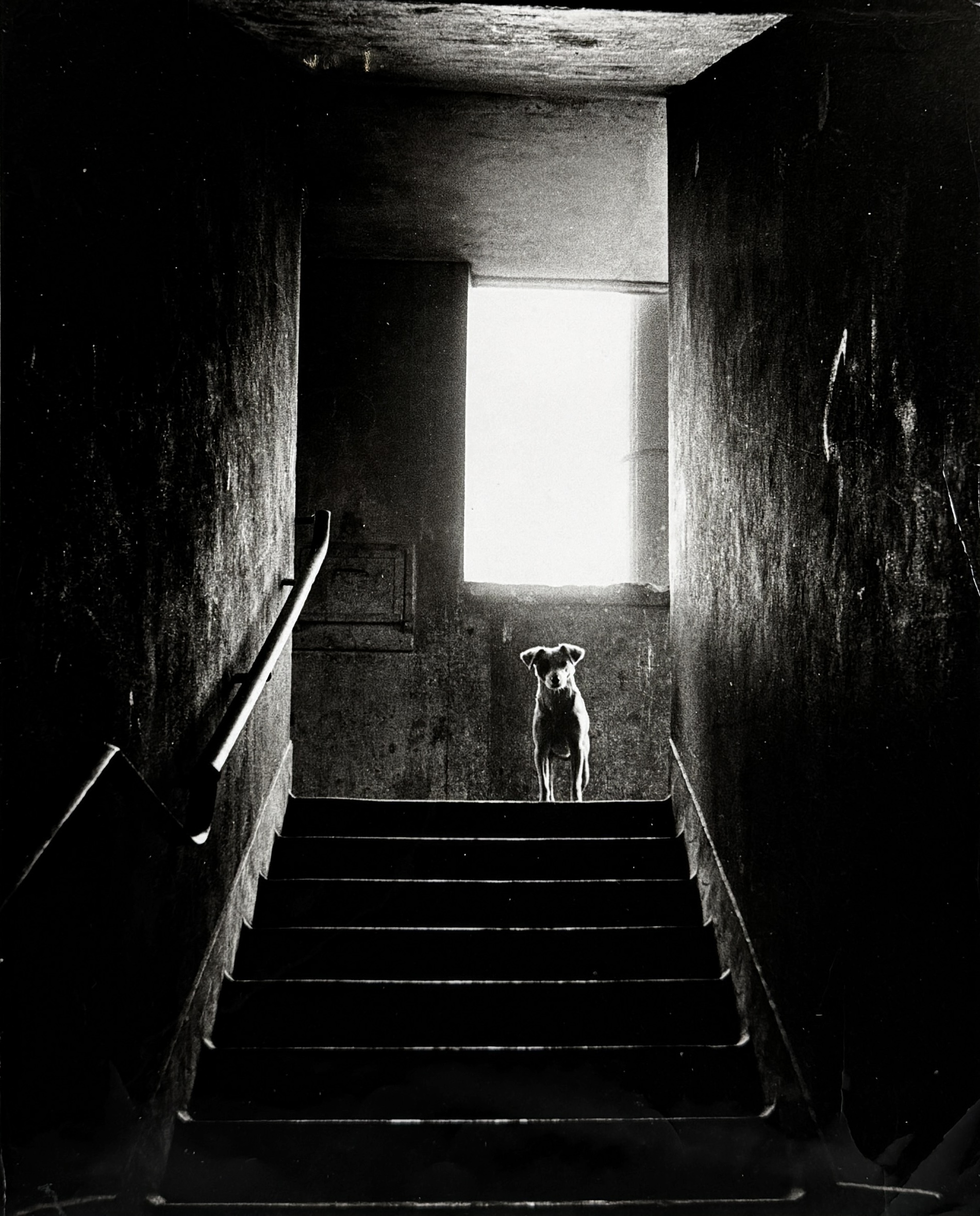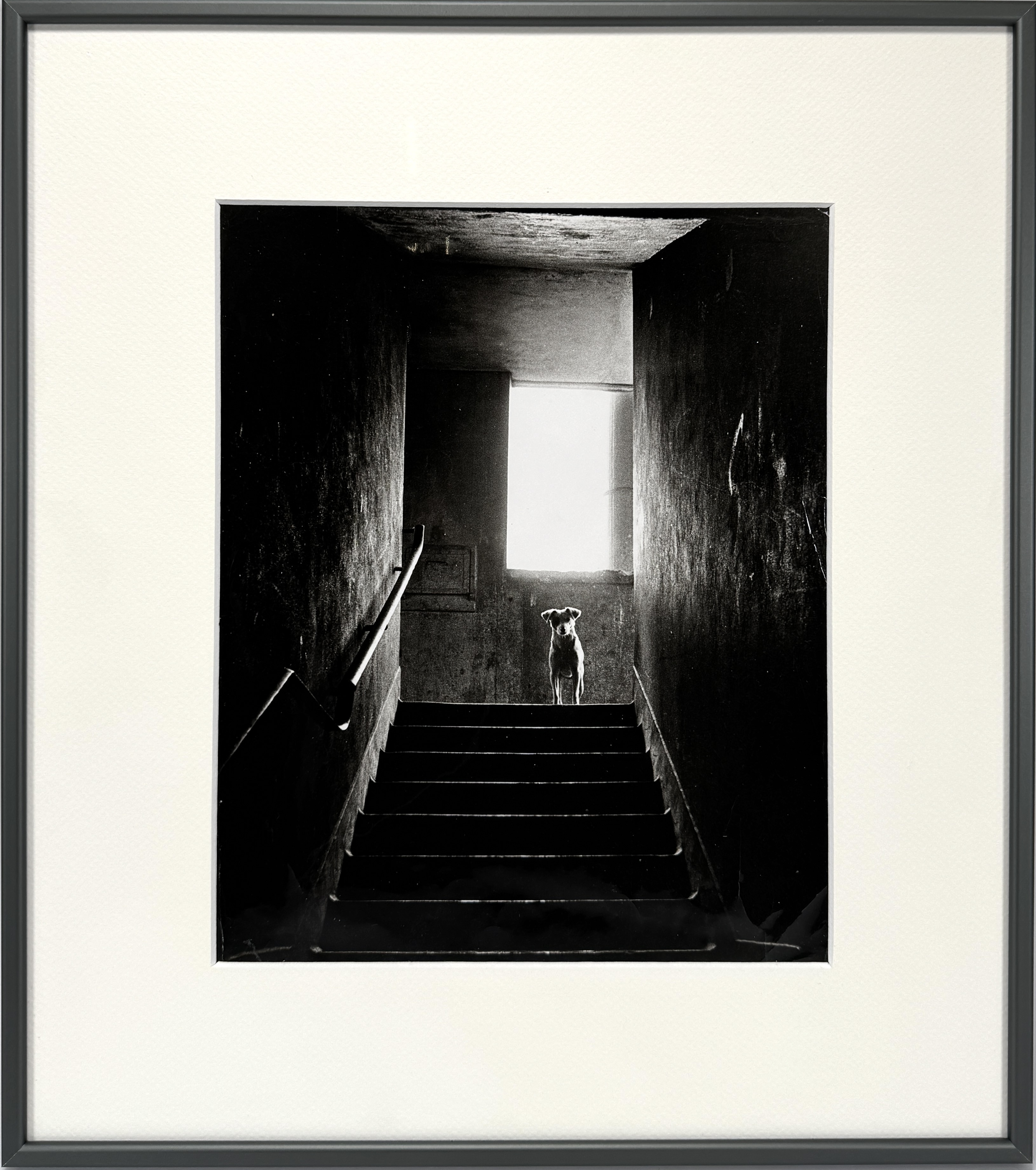 Zwart-witfoto, Jean Hermanson – hond op trap, tweede helft 20e eeuw