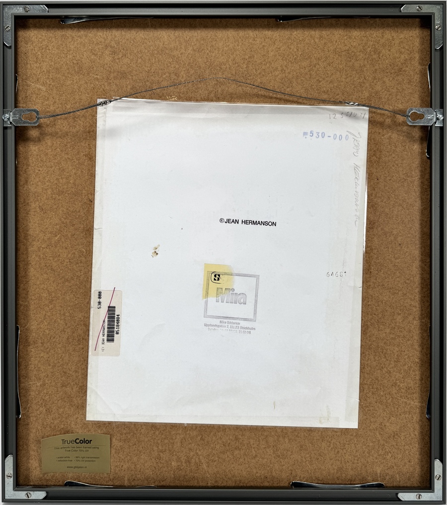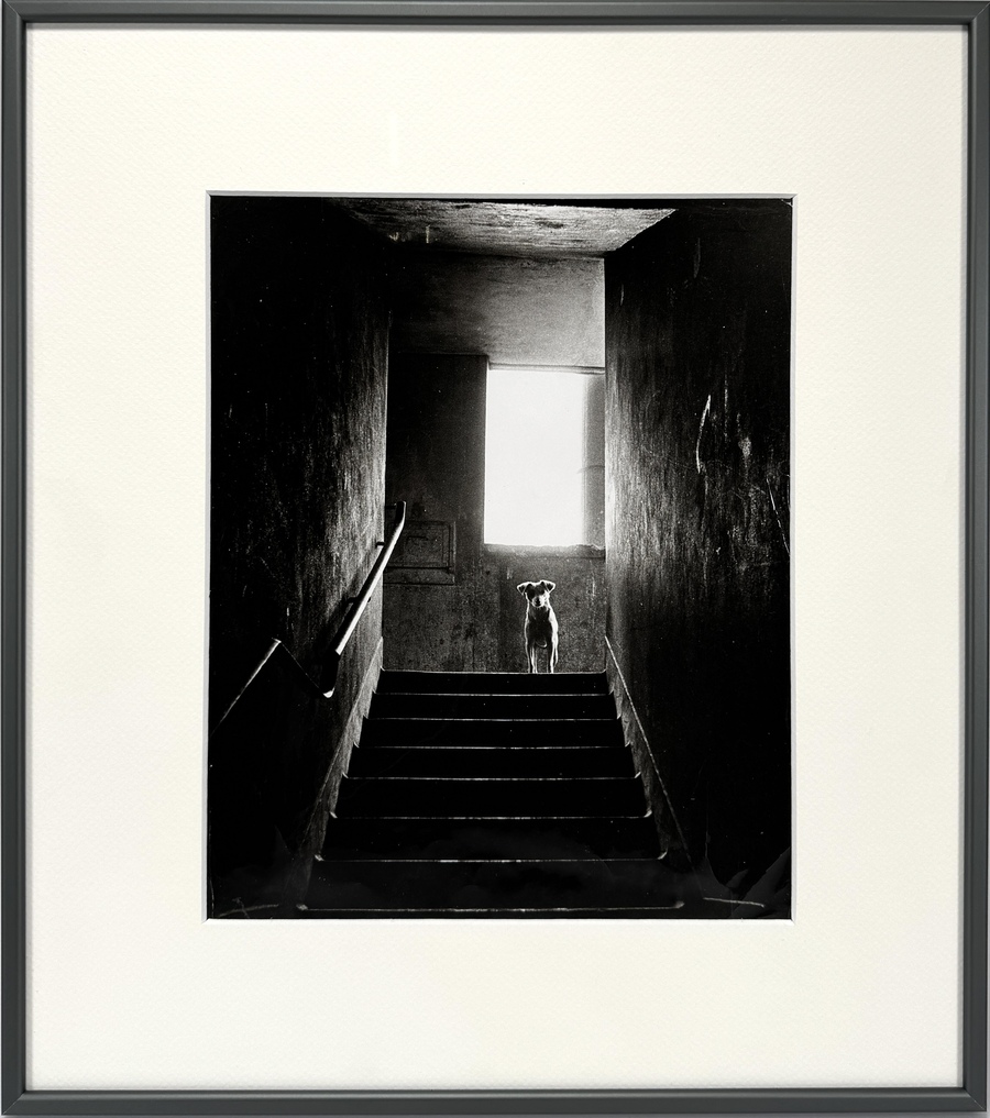 Zwart-witfoto op fotopapier door Jean Hermanson (1938–2012), uitgevoerd als zilvergelatinedruk in sociaal-documentaire stijl, tweede helft 20e eeuw. De compositie toont een hond bovenaan een donkere trap in sterk contrasterend licht. Verso voorzien van copyrightstempel “© Jean Hermanson” en drukstempel Mira Bildarkiv, Stockholm. Ingelijst met wit passe-partout en metalen lijst. Geïnteresseerd? Bezoek onze kijkdagen op 28, 29 of 30 november van 11:00 tot 17:00 uur! |