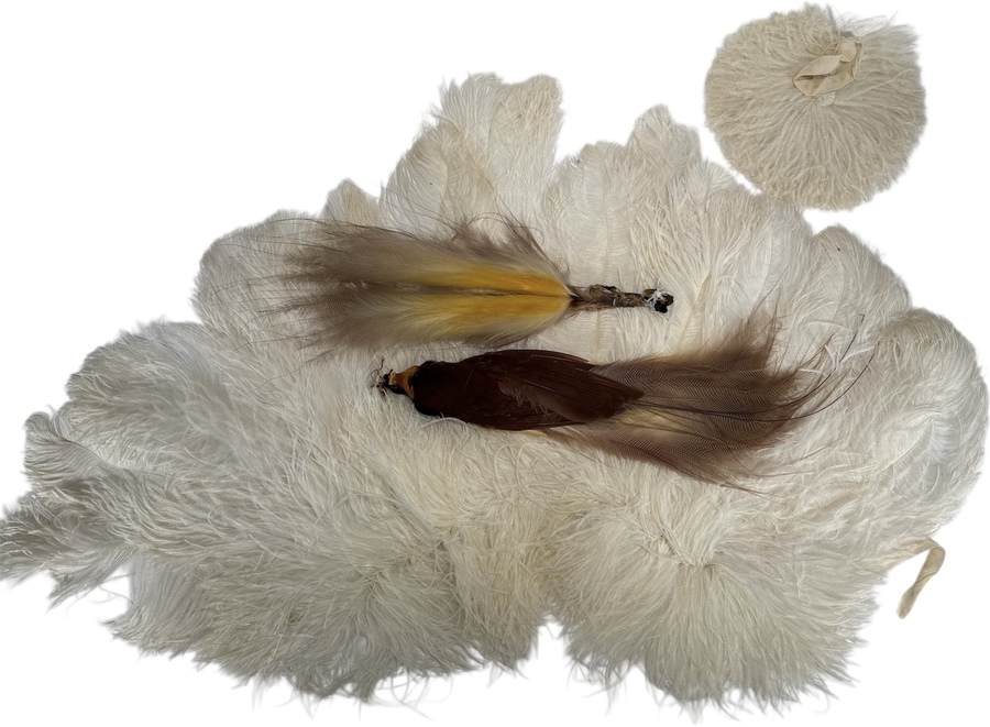Traditionele ceremoniële set uit de 20e eeuw, bestaande uit een paradijsvogel balg en een ronde hoofdtooi vervaardigd uit witte struisvogelveren, textiel en natuurlijke vezels. Handmatig samengesteld door binden, vlechten en taxidermie. Afkomstig uit Papoea-Nieuw-Guinea en gebruikt in ceremoniële contexten als rituele dans of statusattribuut