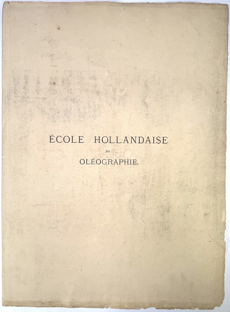 Titelblad École Hollandaise en Oléographie. Chefs-d’oeuvre des Peintres Anciens et Modernes, uitgegeven door Jan Leendertz te Amsterdam in de tweede helft van de 19e eeuw, met teksten van G. Amand, M. W. J. Hofdijk (1816–1888) en inleiding van Charles Blanc (1813–1882). Uitgevoerd in typografische druk en oleografie op zwaar papier, opgedragen aan Zijne Majesteit de Koning der Nederlanden.