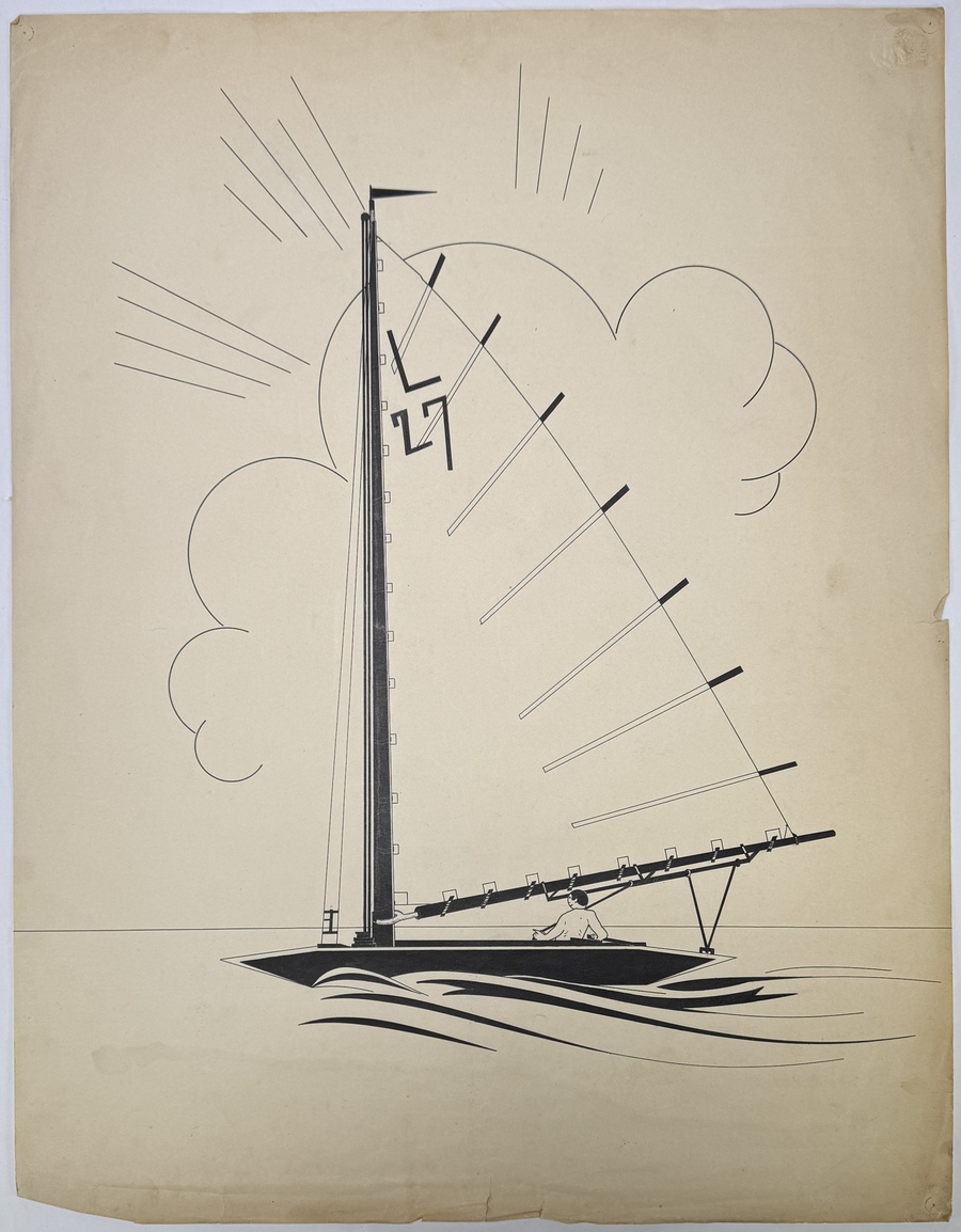 Grafische tekening in modernistische Art Deco stijl, vervaardigd in de eerste helft van de 20e eeuw, voorstellend een zeilboot in gestileerde lijnvoering op zee met zonnestralen op de achtergrond. Uitgevoerd in zwarte inkt op papier, voorzien van blindstempel "Tijger Teekenpapier" rechtsboven.