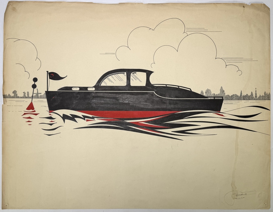 Art Deco tekening, uitgevoerd in inkt en gouache op papier, voorstellende een gestileerde motorboot met zwart en rood kleurgebruik. Het werk toont een horizontale compositie met dynamische waterlijnen, vlakke contrasterende zwart-rood kleurvlakken en wigvormige golven. Onduidelijke gesigneerd en gedateerd 1937 rechtsonder.