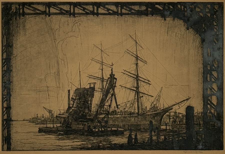Ets in zwart op papier, anonieme maker, voorstellend een groot zeilschip in een haven met kraanconstructies, uitgevoerd in realistische stijl met fijn lijnwerk. Rechtsonder onduidelijk gesigneerd. Het werk dateert uit de eerste helft van de 20e eeuw (circa 1920–1940) en bevindt zich in een goudkleurige lijst met passe-partout.