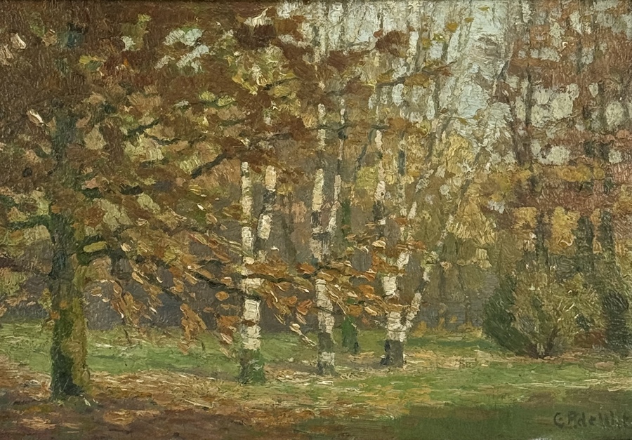 Olieverfschilderij op paneel door Cornelis Pieter de Wit (1882–1975) in naturalistisch-impressionistische stijl, voorstellend een boslandschap met berkenbomen in herfsttooi. Rechtsonder gesigneerd: C.P. de Wit. Het schilderij toont losse penseelvoering, genuanceerd kleurgebruik en een horizontale compositie. Het werk is gedateerd in de eerste helft van de 20e eeuw en bevindt zich in een goudkleurige lijst.