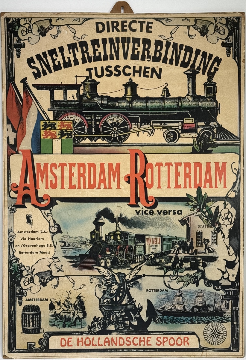 Affiche “Directe sneltreinverbinding tusschen Amsterdam en Rotterdam”, lithografie in kleur op papier, tweede helft 19e eeuw. Grafisch ontwerp in laat Victoriaanse stijl met locomotieven, stadsgezichten en decoratieve omlijsting, uitgegeven door De Hollandsche Spoorwegmaatschappij. De poster is gemonteerd op houten paneel met ophangoog aan de bovenzijde.