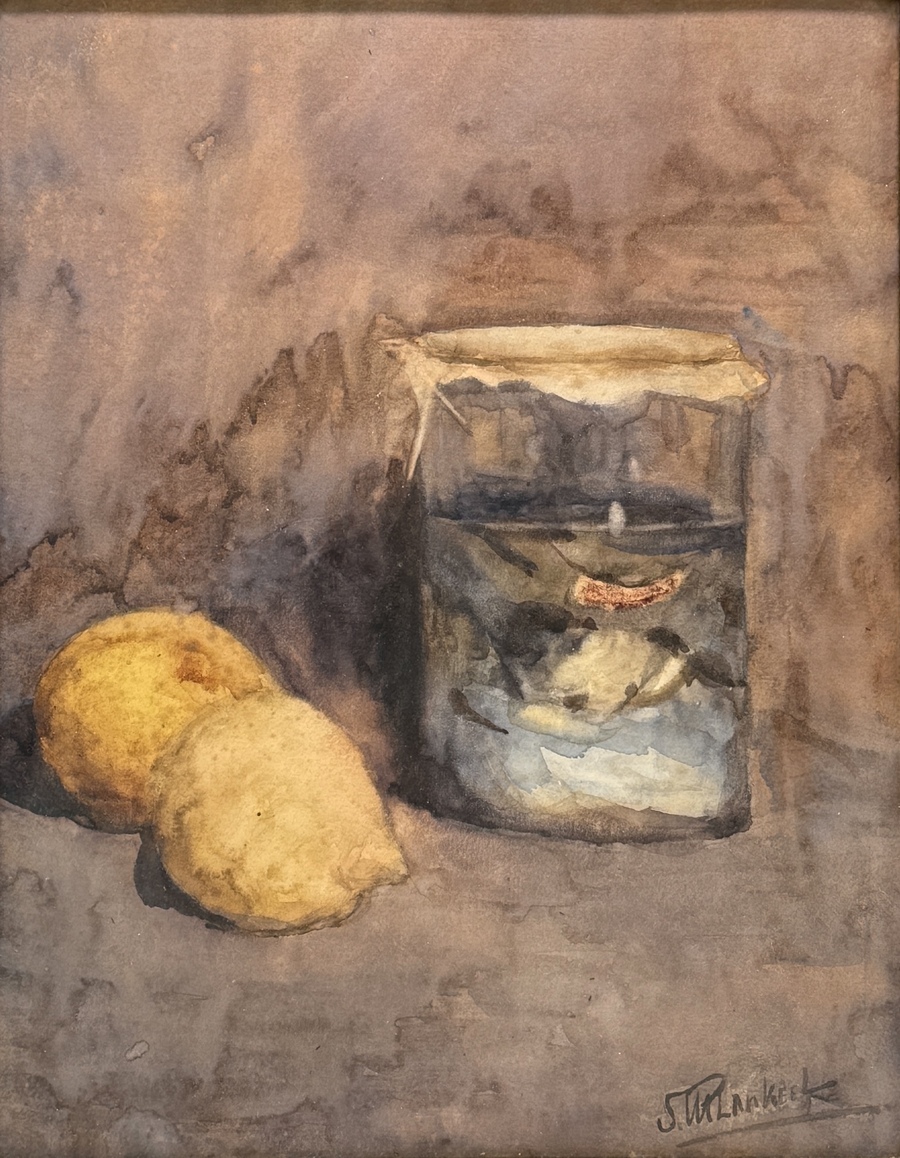 Aquarel op papier toont een stilleven, gesigneerd rechtsonder, uitgevoerd in een impressionistische stijl uit de eerste helft 20e eeuw. Het werk toont in gedempte aardetinten een compositie van een glazen pot met vis, vergezeld van twee gele citroenen op een donkere ondergrond.