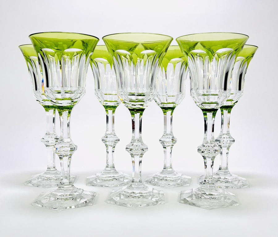 Set van zeven kristallen kelkglazen in helder en olijfgroen glas, vervaardigd in Bohemen in de eerste helft van de 20e eeuw, uitgevoerd in geblazen en diep geslepen kristal met kleur overlay