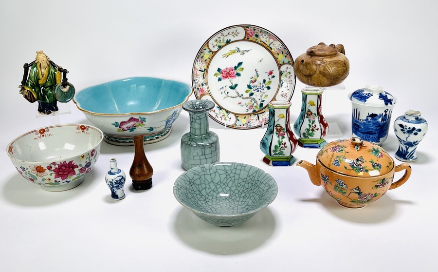 Aziatische keramische objecten onder andere een bord, kommen, miniatuurvaasjes en figuur in uiteenlopende stijlen waaronder Chinees porselein in famille rose, blauw-witdecor, celadon-glazuur en polychroom beschilderde Japanse keramiek. Deels met merken aan de onderzijde, daterend uit de 19e en 20e eeuw, vervaardigd in China en Japan, met handbeschilderde en geglazuurde decoraties in traditionele motieven.