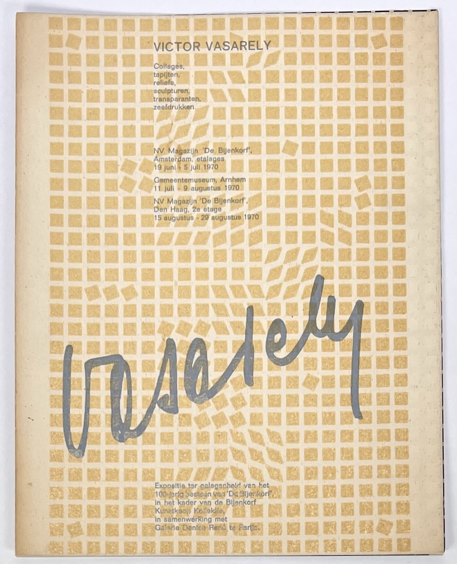 Catalogus van de Hongaars-Franse Op Art-pionier Victor Vasarely (1906–1997), uitgegeven door De Bijenkorf in Nederland ter gelegenheid van het 100-jarig bestaan in 1970. De in offsetdruk vervaardigde catalogus toont geometrische en optisch vervormde rasters en bevat een essay over zijn systematische abstracte kunst. De uitslaande pagina's bevatten kenmerkende zwart-wit Op Art illusies.