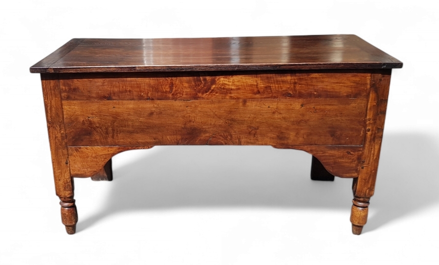 Massief eikenhouten tafelkist in landelijke stijl uit de 19e eeuw, uitgevoerd met rechthoekige opbouw, scharnierend deksel en pen-en-gat constructie. Het meubel rust op vier poten, waarvan de voorste gedraaid zijn, en bevat geprofileerde zaagsneden in de onder regel. Kenmerkend zijn de opstaande plankvormige achterpoten en de vlakke panelen.