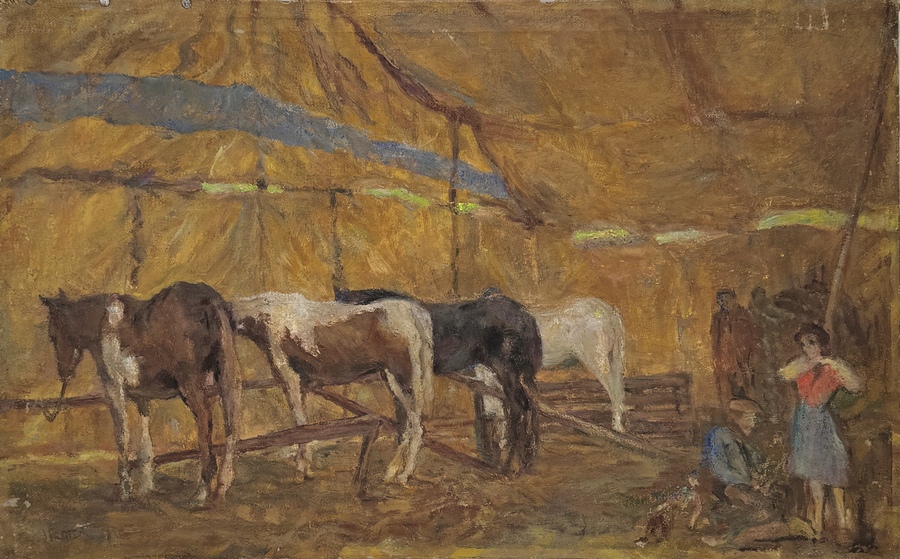 Olieverf op doek door James William Frater (1887–1969), uitgevoerd in impressionistische stijl en daterend uit het midden van de 20e eeuw. Het werk toont paarden in een tentachtige omgeving, met enkele figuren rechts in de compositie. Warme aardetinten en losse penseelvoering versterken het levendige karakter van de voorstelling.