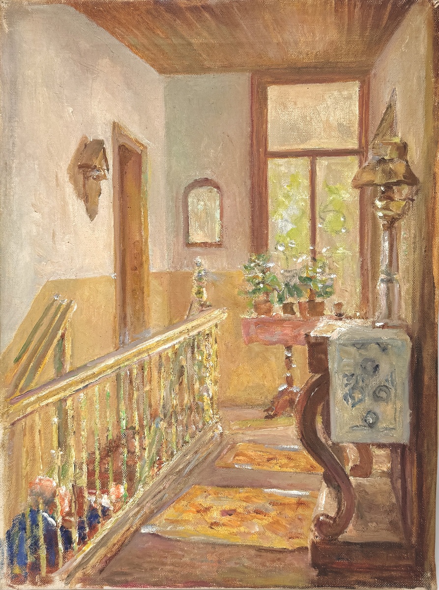Dubbelzijdig schilderij, olieverf op doek door James William Frater (1887–1969), uitgevoerd in impressionistische stijl en gedateerd ca. 1920–1940. De voorzijde toont een keukeninterieur met tafel en raam, de keerzijde een gang met trapopgang, spiegel en planten. Het werk is kenmerkend door losse penseelvoering, warme aardetinten en sfeervolle lichtinval.