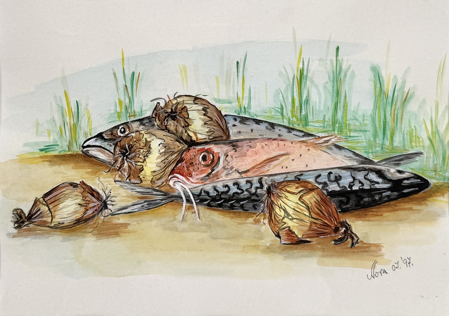 367. Aquarel, Nora – stilleven met vissen en uien, 1997