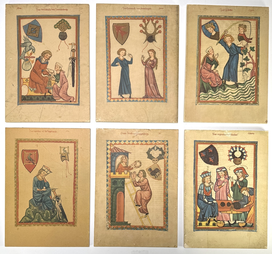 Zes chromolithografieën op papier, gemonteerd op houten panelen, uitgevoerd in middeleeuwse hofstijl naar de Codex Manesse (ca. 1300). Voorstellingen van minnezangers met wapenschilden en gotische kaderranden in rood, blauw en goudtinten. Duits werk uit de eerste helft van de 20e eeuw, uitgevoerd als decoratieve reeks van historische reproducties.