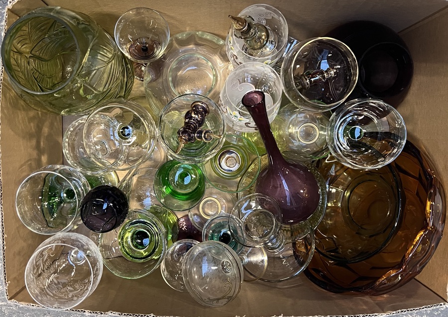 Doos met diverse glazen curiosa uit de twintigste eeuw, bestaande uit kleurloos, groen, amberkleurig en paars glaswerk, waaronder karafjes, bekers, schalen en flacons. De verzameling vertegenwoordigt decoratief glaswerk uit verschillende Europese glascentra van midden tot late twintigste eeuw.