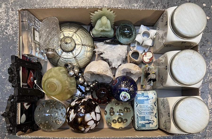 Verzameling curiosa bestaande uit diverse glasobjecten zoals presse-papiers met luchtbellen, een jade-imitatie Boeddha, kwartskristallen en geodes, keramische Art Deco voorraadpotten, een gehamerde metalen doos en een blik met blauw neoklassiek decor. Vervaardigd in Europa en Azië in de 20e eeuw.