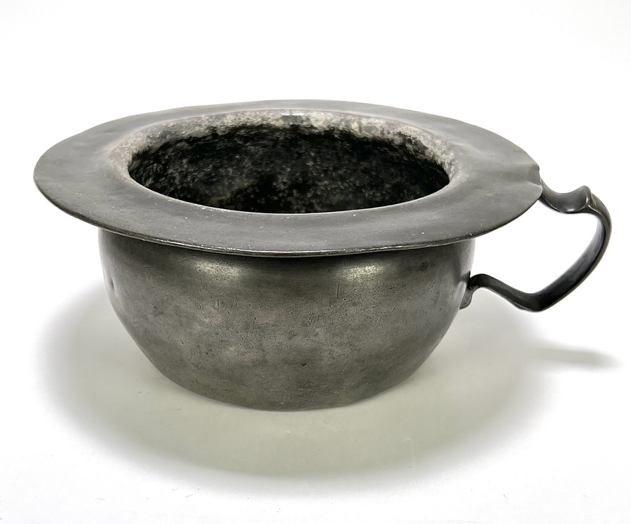 Tinnen nachtspiegel met lage bolle komvorm en een brede platte rand, vervaardigd door middel van metaalgieten in Duitsland, ca. 1890. Op de bodem bevindt zich het meesterstempel 'LRB' binnen een gekroonde markering van de tingieter Ludwig Rettenmaier, Schwäbisch Gmünd, alsook een keurmerk van een engelfiguur binnen een cartouche. Het utilitaire object in traditionele stijl heeft een donkere patina.