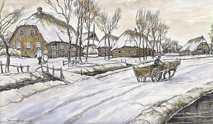 Aquarel door Johannes (Jos) van Dijk (1913–1998) op papier, gesigneerd linksonder "Jos. van Dijk", daterend circa 1950–1970. De voorstelling toont een realistisch Nederlands winterlandschap met rietgedekte boerderijen, figuren en een paard en wagen, uitgevoerd in inkt en aquarelverf met losse penvoering.