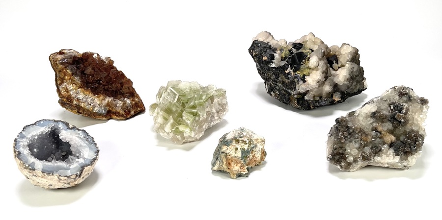 Zes mineralen waaronder een geode met amethist- en chalcedoonvorming, een bruine calciet geode, een heldergroene fluorietcluster en drie overige kristallijne stalen met kwartsgroei, uit geologische vorming van miljoenen jaren geleden. De mineralen tonen natuurlijke kristalvorming en variatie in kleur en structuur, afkomstig uit geologische afzettingen van vermoedelijk Europese of Zuid-Amerikaanse herkomst.