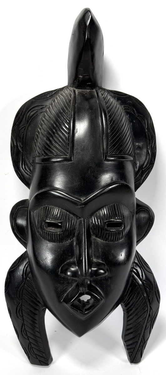 Afrikaans houten masker in een langwerpige stijl, kenmerkend voor de traditionele West-Afrikaanse maskerkunst. Het masker is vervaardigd uit tropisch hardhout en gedateerd in de tweede helft 20e eeuw. De toegepaste techniek is houtsnijwerk met een afwerking in donkere patina. Het masker heeft een gestileerd kapsel met ribbels en een verhoogde bekroning, gecombineerd met glanzende gelaatstrekken.