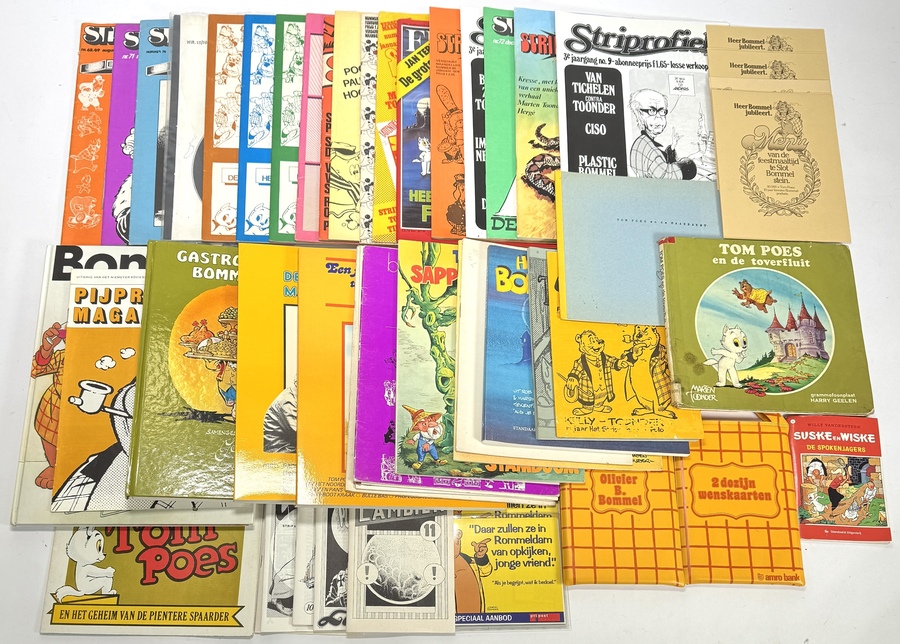 Verzameling boeken en tijdschriften rond Marten Toonder (1912–2005) en zijn Toonder-studio’s met o.a. Tom Poes, Heer Bommel, Gastronomisch Bommelboek en publicaties uit het Tom Poes Weekblad, vervaardigd tussen 1947 en 1990 in Nederland. Gedrukt in offsettechniek op papier en karton, deels door uitgeverijen De Bezige Bij en Personalia.