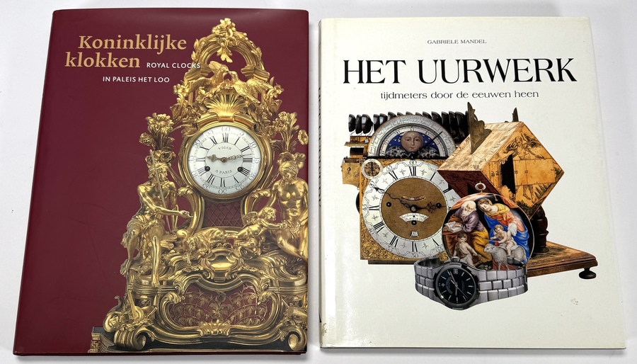 Twee kunsthistorische naslagwerken over uurwerken: Koninklijke klokken – Royal Clocks in Paleis Het Loo (Waanders Uitgevers, Zwolle) en Het Uurwerk – Tijdmeters door de eeuwen heen van Gabriele Mandel. Beide hardcover uitgaven met linnen band en stofomslag, rijk geïllustreerd in kleur met foto’s, technische schema’s en begeleidende teksten over klokken en horloges van de 16e tot 20e eeuw.