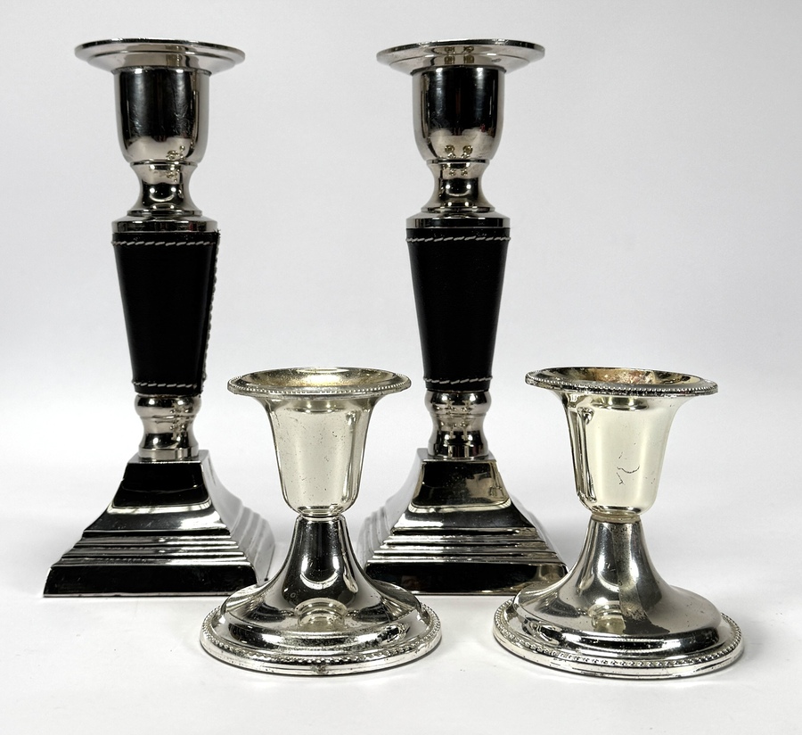 Vier kandelaren van verzilverd metaal, daterend uit de tweede helft 20e eeuw. Twee kleinere kandelaren zijn uitgevoerd in een traditionele stijl, terwijl de twee grotere kandelaren een Mid-century modern design hebben met zwarte bekleding en een vierkante voet.