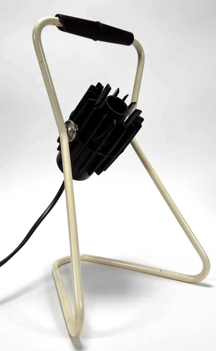 Tafellamp Philips model KL2901, midden 20e eeuw, uitgevoerd in gelakt stalen buisframe met kunststof (bakeliet) lamphuis voorzien van koelribben, verstelbaar scharniermechanisme en originele kabel met schakelaar. Ontworpen als industriële werk- of bureaulamp in modernistische stijl, geproduceerd door Philips Eindhoven.
