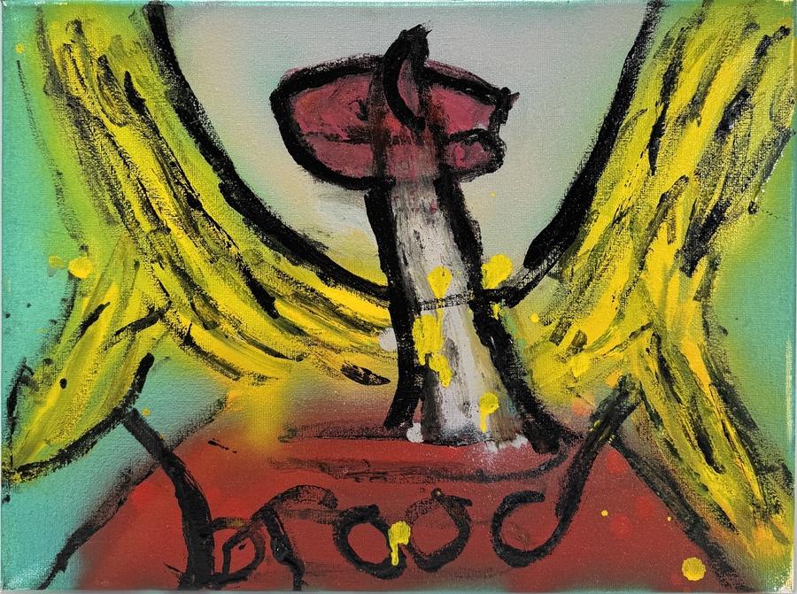 Acrylverfschildering op doek in een expressieve stijl naar Herman Brood, eind 20e eeuw. De voorstelling toont een geabstraheerd figuur met gele vleugelachtige streken op een rode ondergrond.