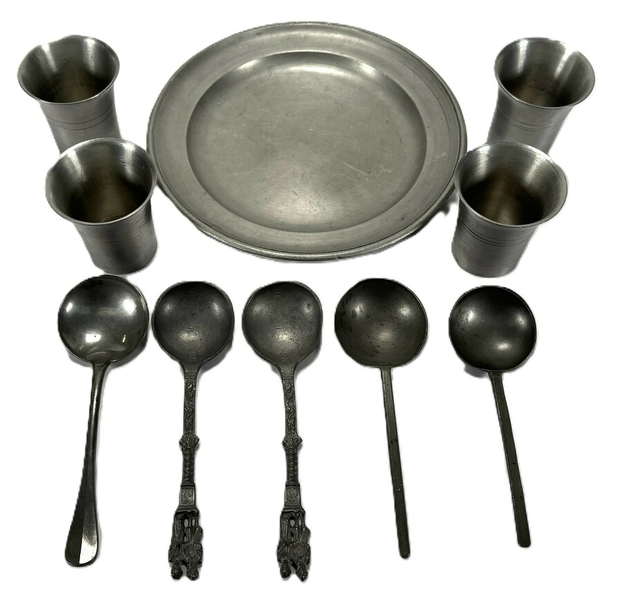 Lot van tien tinnen serviesdelen, bestaande uit één schaal met datering 1889, vier bekers en vijf lepels van waarschijnlijke Centraal-Europese herkomst. De lepels zijn deels uitgevoerd in een historiserende stijl met figuratie op de stelen. Het tin is gemerkt met onder andere 'Rein Zinn 92%' en 'BERG.'.