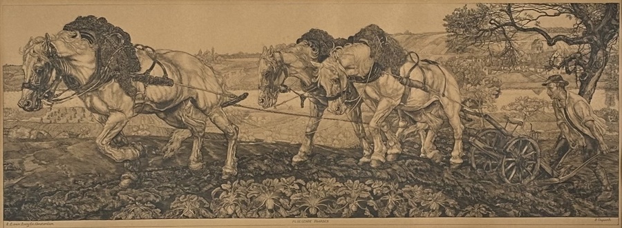 Kopergravure op papier door Pieter Dupont (1870–1911), getiteld “Ploegende Paarden”, uitgegeven door S.L. van Looy, Amsterdam. Gesigneerd in de plaat en voorzien van potloodnotitie “druk goedgekeurd”. Naturalistisch tafereel van een boer met drie werkpaarden in het veld, gedrukt in bruine inkt. Nederlandse editie, 1904, in goudkleurige lijst.