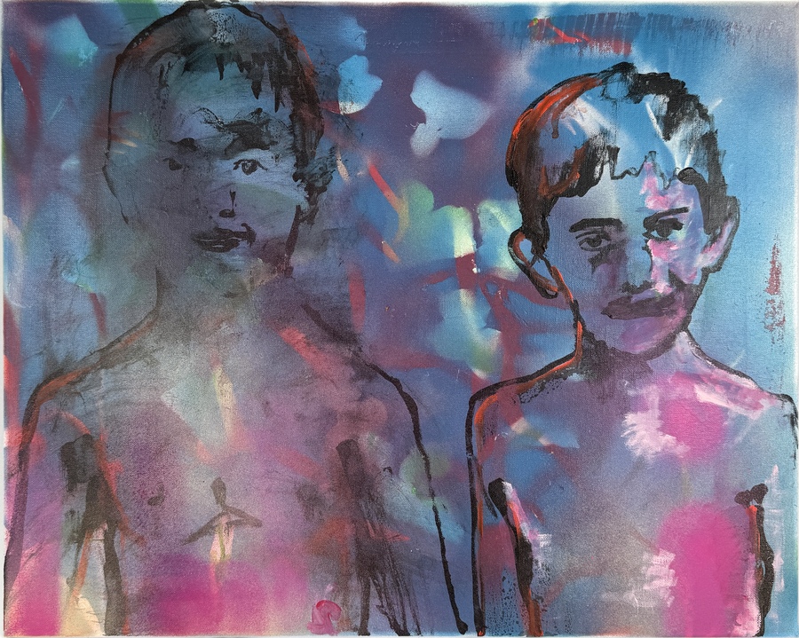 Acrylverfschilderij op doek door A BROKEN UNIVERSE (Ecuadoraanse kunstenaar, gevestigd in Nederland), gedateerd 2022. Het hedendaagse figuratieve werk toont twee halfnaakte figuren tegen een expressieve meerkleurige achtergrond in blauw-, paars- en roze-tinten. De combinatie van penseel- en spraytechniek weerspiegelt invloeden van Street Art. Verso gemonogrammeerd, gesigneerd en gedateerd.