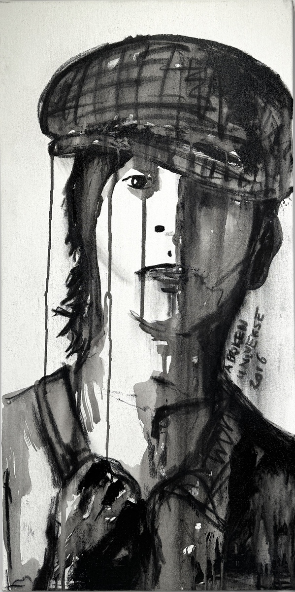 Acrylverfschilderij op doek door A BROKEN UNIVERSE (Ecuadoraanse kunstenaar, gevestigd in Nederland), gedateerd 2016. Het expressieve monochrome portret toont een jonge man met pet, opgebouwd uit losse penseelstreken en druiplijnen in grijs- en zwarttinten. Recht in het midden gesigneerd en gedateerd, verso gemerkt.