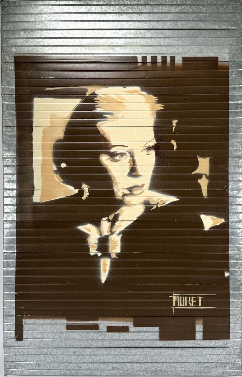 Graffiti kunstwerk in Stencil Art techniek met spuitverf op gegalvaniseerd metaal (ribbelplaat) van de kunstenaar Moret. Het hedendaagse werk uit circa 2000–2020 toont een gelaagd, fotorealistisch vrouwenportret in donkerbruin en beige tinten. De achterzijde bevat de tag 'MORET' in stencil en een handgeschreven opdracht in het Nederlands.