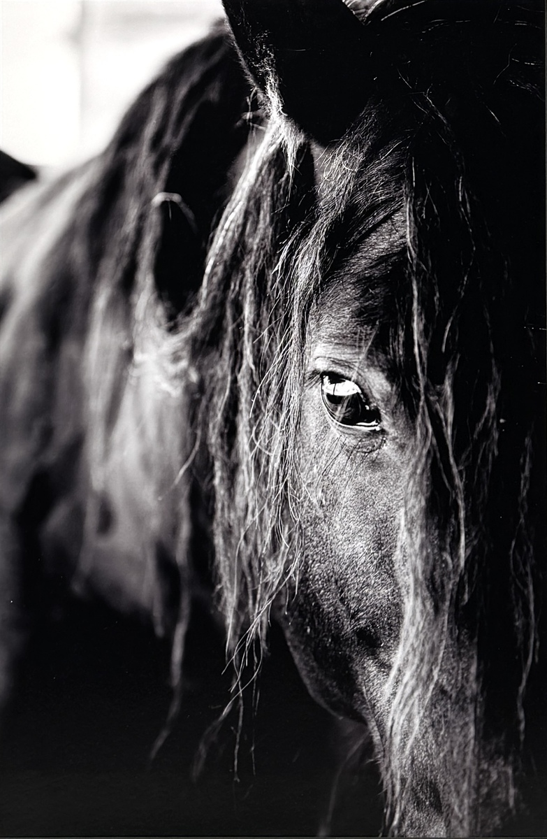 Fotoprint op papier van Caroline Mercier (1981), getiteld “Resilience II”, een zwart-wit paardenportret in A3+-formaat, oplagenummer 1/30. Uitgevoerd als fine art print op Hahnemühle-papier, 21e eeuw Frankrijk. Het werk toont een intens close-up beeld van een paard met sterke licht-schaduwcontrasten en realistische stijlkenmerken.