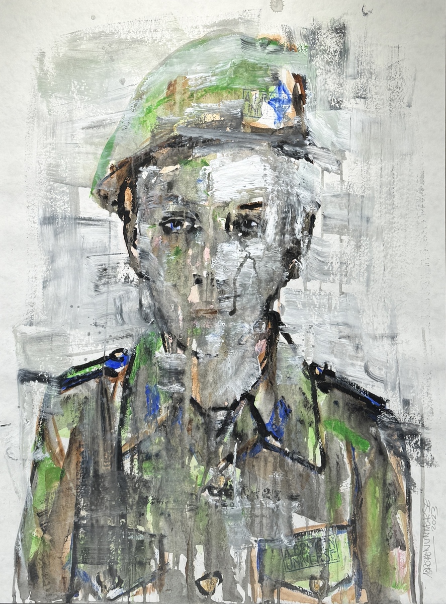 Gemengde techniek, aquarel en acryl op papier, door A BROKEN UNIVERSE (Ecuadoraanse kunstenaar, gevestigd in Nederland), gedateerd 2023. Het expressieve figuratieve werk toont een soldaat met groene baret, opgebouwd in transparante lagen met witte en groene tinten. De combinatie van Street-, Cobra- en popartinvloeden geeft het portret een eigentijdse, gelaagde uitstraling. Rechtsonder gesigneerd en gedateerd.