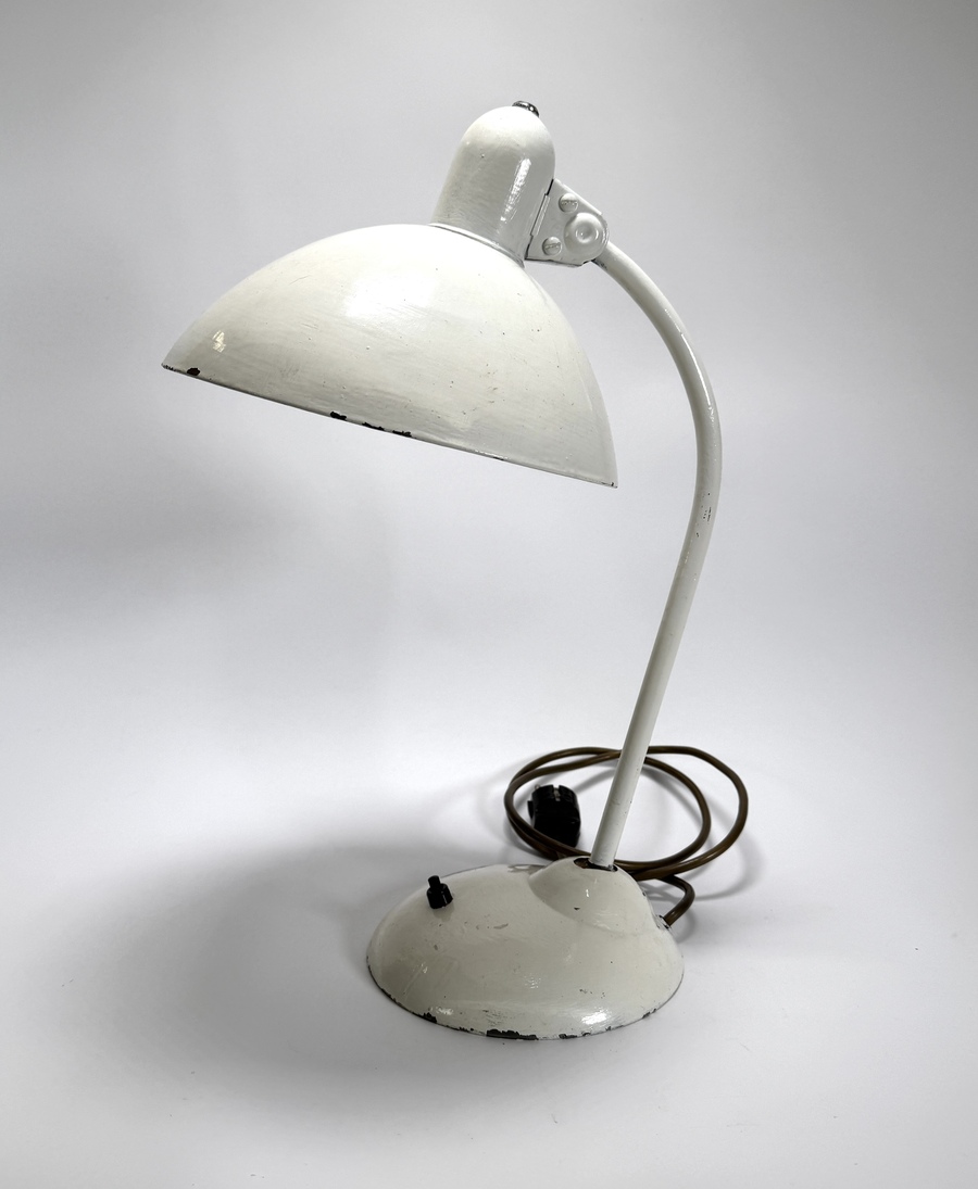 Klassieke metalen tafellamp model 6556-T, ontworpen door Christian Dell (1893–1974) in 1931 voor KAISER idell, uitgevoerd met gelakt stalen voet en gebogen metalen staander, een halfronde verstelbare kap en een scharnierende zwenkverbinding. Typerend voor de Duitse industrieel ontwerpbenadering van het interbellum, geproduceerd door Gebr. Kaiser & Co in Neheim-Hüsten, Duitsland.