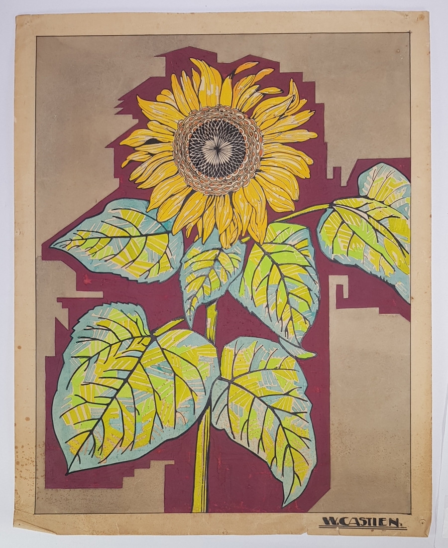 Tekening door W. Castien, uitgevoerd in gouache en inkt op papier, Art Deco, circa 1920–1940. Het werk toont een gestileerde zonnebloem met geometrische achtergrond in rood, geel en groen. Kenmerkend zijn de decoratieve vlakverdeling, strakke contouren, gesigneerd in de onderrand.