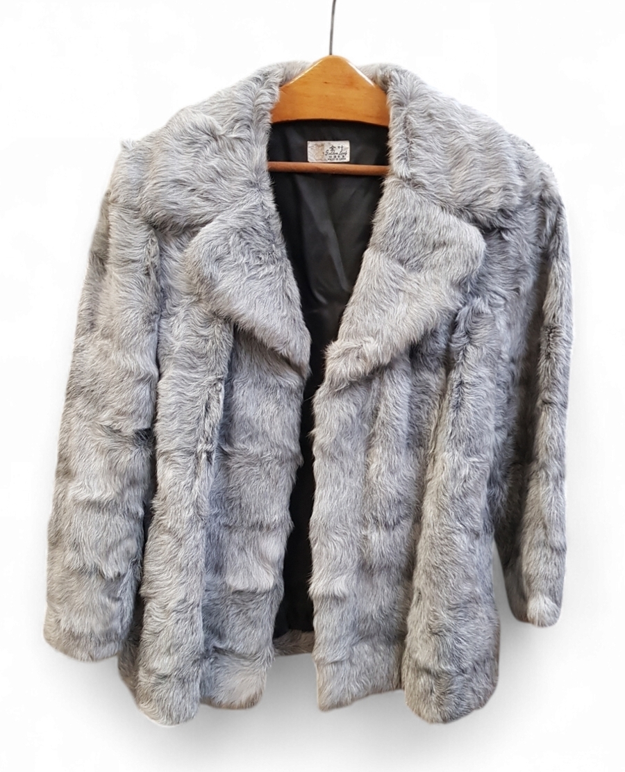 Korte bontjas, Mid-century modern stijl met kenmerken van de jaren '70 mode, uitgevoerd in grijs gemêleerd bont en afgewerkt met een zwarte textielvoering. Kenmerkend voor dit vintage kledingstuk is de rechte snit en de royale reverskraag. De jas is van Chinese herkomst en circa 1970–1980 gedateerd.